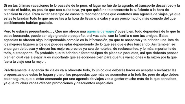 peor, el lugar no fué de tu agrado, el transporte desastroso y la comida ni hablar, es posible que sea culpa tuya, ya que quizá no te asesoraste lo suficiente a la hora de planificar tu viaje. Para evitar este tipo de casos te recomendamos que contrates una agencia de viajes, ya que estas te brindan todo lo que necesitas a la hora de llevarlo a cabo y a un precio mucho más cómodo del que posiblemente habrías gastado. Pero te estarás preguntando... ¿Que me ofrece una agencia de viajes? pues bien, todo dependerá de lo que tu estes buscando, puede ser algo grande o pequeño, o si vas solo, con la familia o con tus amigos. Estas agencias te ofrecen algo indispensable como lo es la información, ya que te asesoran y te brindan una lista de los mejores lugares a los que puedes optar dependiendo de lo que sea que estés buscando. Así también se encargan de buscar y ofrecer los mejores precios ya sea de hoteles, de restaurantes, y lo más importante de todo, el transporte. Es probable que te brindan diferentes tipos de planes o paquetes, así que deberás pensar bien en cual vas a elegir, y es importante que selecciones bien para que tus vacaciones o la razón por la que fuera tu viaje sea la mejor. Prácticamente la agencia de viajes va a ofrecerte todo, lo único que deberás hacer es aceptar o rechazar las propuestas que estas te hagan y claro, las propuestas que más se acomoden a tu bolsillo, pero de algo debes estar seguro, que al estar asesorado por una agencia de viajes vas a gastar mucho más de lo que pensabas, ya que muchas veces ofrecen promociones y descuentos especiales.
