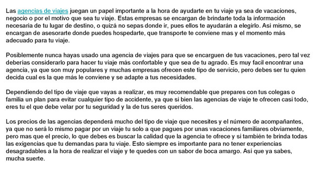 hora de ayudarte en tu viaje ya sea de vacaciones, negocio o por el motivo que sea tu viaje. Estas empresas se encargan de brindarte toda la información necesaria de tu lugar de destino, o quizá no sepas donde ir, pues ellos te ayudarán a elegirlo. Así mismo, se encargan de asesorarte donde puedes hospedarte, que transporte te conviene mas y el momento más adecuado para tu viaje. Posiblemente nunca hayas usado una agencia de viajes para que se encarguen de tus vacaciones, pero tal vez deberías considerarlo para hacer tu viaje más confortable y que sea de tu agrado. Es muy facil encontrar una agencia, ya que son muy populares y muchas empresas ofrecen este tipo de servicio, pero debes ser tu quien decida cual es la que más le conviene y se adapte a tus necesidades. Dependiendo del tipo de viaje que vayas a realizar, es muy recomendable que prepares con tus colegas o familia un plan para evitar cualquier tipo de accidente, ya que si bien las agencias de viaje te ofrecen casi todo, eres tu el que debe velar por tu seguridad y la de tus seres queridos. Los precios de las agencias dependerá mucho del tipo de viaje que necesites y el número de acompañantes, ya que no será lo mismo pagar por un viaje tu solo a que pagues por unas vacaciones familiares obviamente, pero mas que el precio, lo que debes es buscar la calidad que la agencia te ofrece y si también te brinda todas las exigencias que tu demandas para tu viaje. Esto siempre es importante para no tener experiencias desagradables a la hora de realizar el viaje y te quedes con un sabor de boca amargo. Así que ya sabes, mucha suerte.