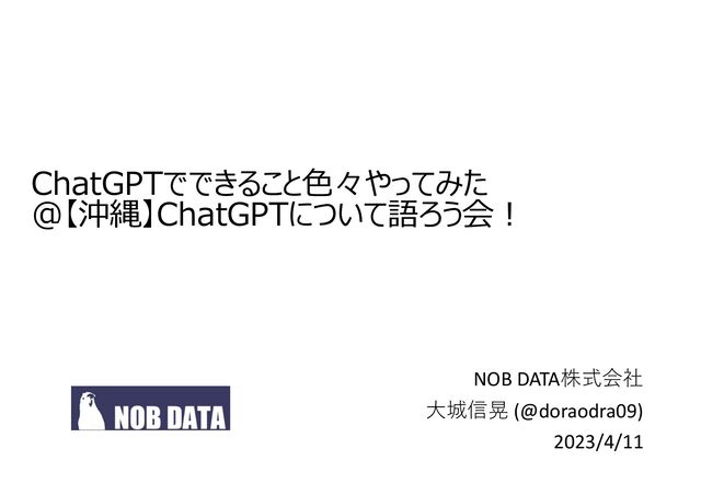 NOB DATA株式会社 代表取締役社⻑ / データサイエンティスト協会 九州⽀部 委員⻑ ・住まい 沖縄 -> 東京 -> 福岡 ・職歴 ヤフー-> DATUM STUDIO -> LINE Fukuoka -> NOB DATA(株) 創業 ・運営コミュニティ ・過去 ・Tokyo.R(2010-2016) ・現在 ・fukuoka.R、PyData.Fukuoka、 意思決定のためのデータ分析勉強会、 オモシロAIごった煮勉強会、ChatGPT部 ⽯垣⽣まれ、⼤宜味村育ち。 琉⼤の電気電⼦->修⼠卒です(2009/3)