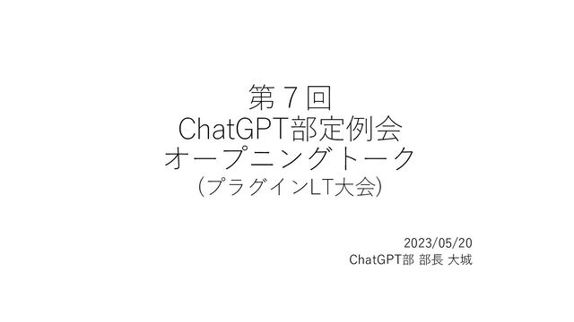 ・デイリーニュース・海外版も!(⽥中丸さん、⼤釜さん) [この1週間の⼤城近況] ・飲み会でChatGPTを啓蒙活動 ・DS協会九州⽀部のChatGPTハンズオンイベント(福岡) ・この後、もう1つ勉強会(意思決定@福岡) ・3つくらい、ChatGPTセミナーの依頼 [来週の予定・⼤城] ・Yakitori.R(5/27⼟) ・ChatGPTのお仕事相談対応 • 本⽇の流れ • 今週のnote記事⼀覧 • 録画禁⽌アナウンス • オープニングトーク • ChatGPTについて • ChatGPT部の活動について • 近況と気になるNEWS • 各⾃⾃⼰紹介 • LT & ディスカッション • LT • プラグインディスカッション • クロージング&次回相談 • 次回は著作権 • その次は何にしましょう? • リスキリング?未来?