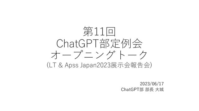 ・ 【ニュースまとめ号外】ChatGPT API 関数呼び出しなど 強⼒アップデート!(2023.6.13) (⽥中丸さん) ・再掲:タイガー⽒によるChatGPT部新聞 [この1週間の⼤城近況] ・6/14-16 Apps Japan2023展⽰会 & セミナー ・6/16 沖縄のお客さん向け500名規模セミナー ・展⽰会での講演がYahoo!ニュースに載りました・・! (Itmediaさん記事) (・北⽖さん主催のハッカソンは残念ながら私の余⼒がなく⽋席 ) [来週の予定・⼤城] ・6/19(⽉) 企業さん向けにChatGPT活⽤のミニセミナー ・6/24(⼟) 教育 x ChatGPTのセミナー登壇予定 ・DXの書籍の担当分が遅れてるのでそちらやる ・次の3ヶ⽉の戦略検討 (展⽰会以降) • 本⽇の流れ • 録画禁⽌アナウンス • オープニングトーク • ChatGPTについて • ChatGPT部の活動について • 初参加者の⾃⼰紹介 • 1週間の振り返り&今後の予定 • LT & ディスカッション • LT • 展⽰会の報告会 • クロージング&次回相談 • 次回は著作権 • その次は何にしましょう? • リスキリング?未来?