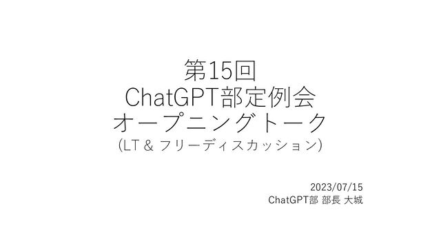 ・そういえば誕⽣⽇でした ・windows copilot調査 -> 30点くらい ・Google Bardの画像解析機能調査 -> 45点くらい ・商談が増えてきましたが各社ChatGPTの解像度は低めな印象 ・本⽇午後からTokyo.Rのサテライト会の企画(私は東京で参加) -> なんだかんだで時間が⾜りない・・ [来週の予定・⼤城] ・後半は⼤阪出張 ・基本的には仕事していると思います -> その次の週が結構忙しくなる予定 (ごった煮会、あとDSセミナーが1つ) • 本⽇の流れ • 録画禁⽌アナウンス • オープニングトーク • ChatGPTについて • ChatGPT部の活動について • 初参加者の⾃⼰紹介 • 1週間の振り返り&今後の予定 • LT & ディスカッション • LT • 展⽰会の報告会 • クロージング&次回相談 • 次回は著作権 • その次は何にしましょう? • リスキリング?未来?