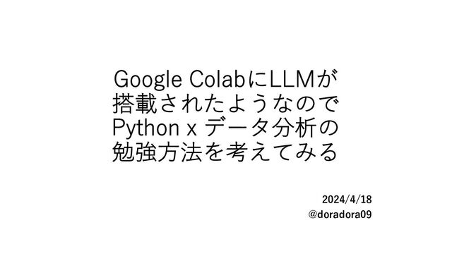 Google ColabにLLMが 搭載されたようなので Python x データ分析の 勉強⽅法を考えてみる 2024/4/18 @doradora09