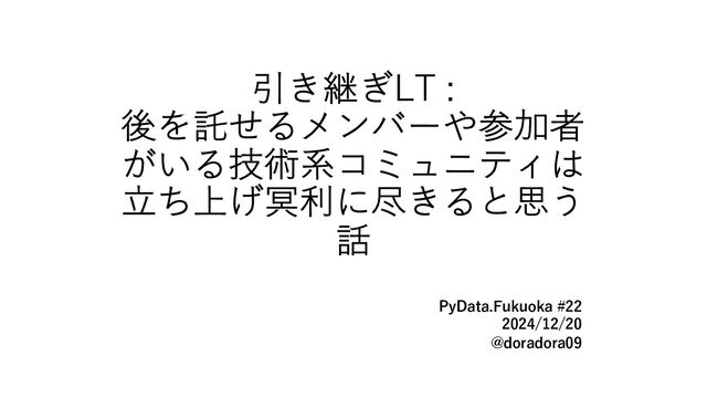 引き継ぎLT : 後を託せるメンバーや参加者 がいる技術系コミュニティは ⽴ち上げ冥利に尽きると思う 話 PyData.Fukuoka #22 2024/12/20 @doradora09