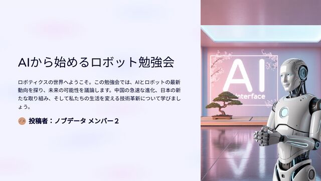 AIから始めるロボット勉強会 ロボティクスの世界へようこそ。この勉強会では、AIとロボットの最新 動向を探り、未来の可能性を議論します。中国の急速な進化、日本の新 たな取り組み、そして私たちの生活を変える技術革新について学びまし ょう。 投稿者:ノブデータ メンバー2 ノメ