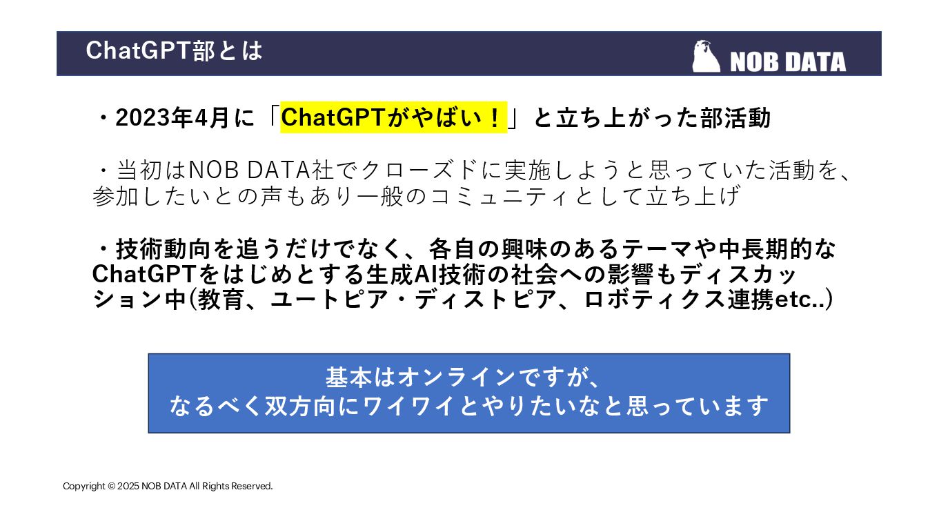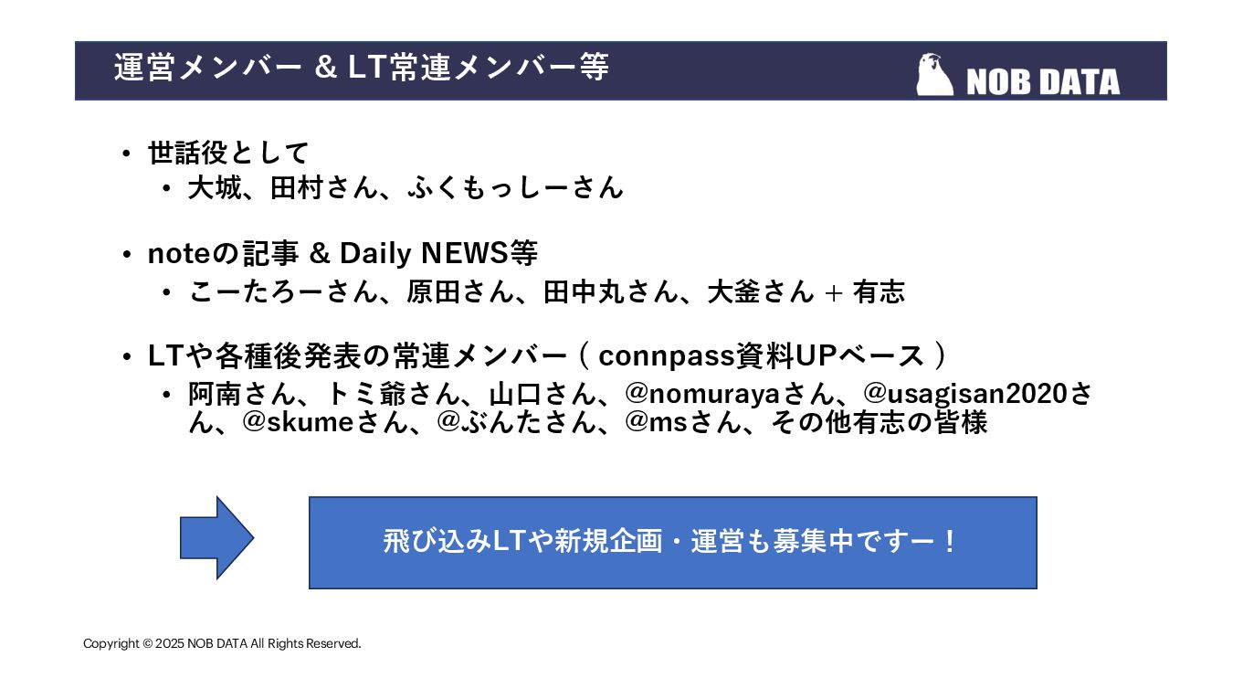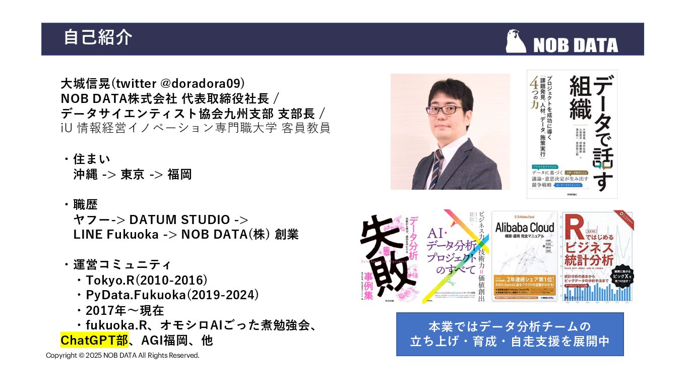 @doradora09) NOB DATA株式会社 代表取締役社⻑ / データサイエンティスト協会九州⽀部 ⽀部⻑ / iU 情報経営イノベーション専⾨職⼤学 客員教員 ・住まい 沖縄 -> 東京 -> 福岡 ・職歴 ヤフー-> DATUM STUDIO -> LINE Fukuoka -> NOB DATA(株) 創業 ・運営コミュニティ ・Tokyo.R(2010-2016) ・PyData.Fukuoka(2019-2024) ・2017年〜現在 ・fukuoka.R、オモシロAIごった煮勉強会、 ChatGPT部、AGI福岡、他 本業ではデータ分析チームの ⽴ち上げ・育成・⾃⾛⽀援を展開中