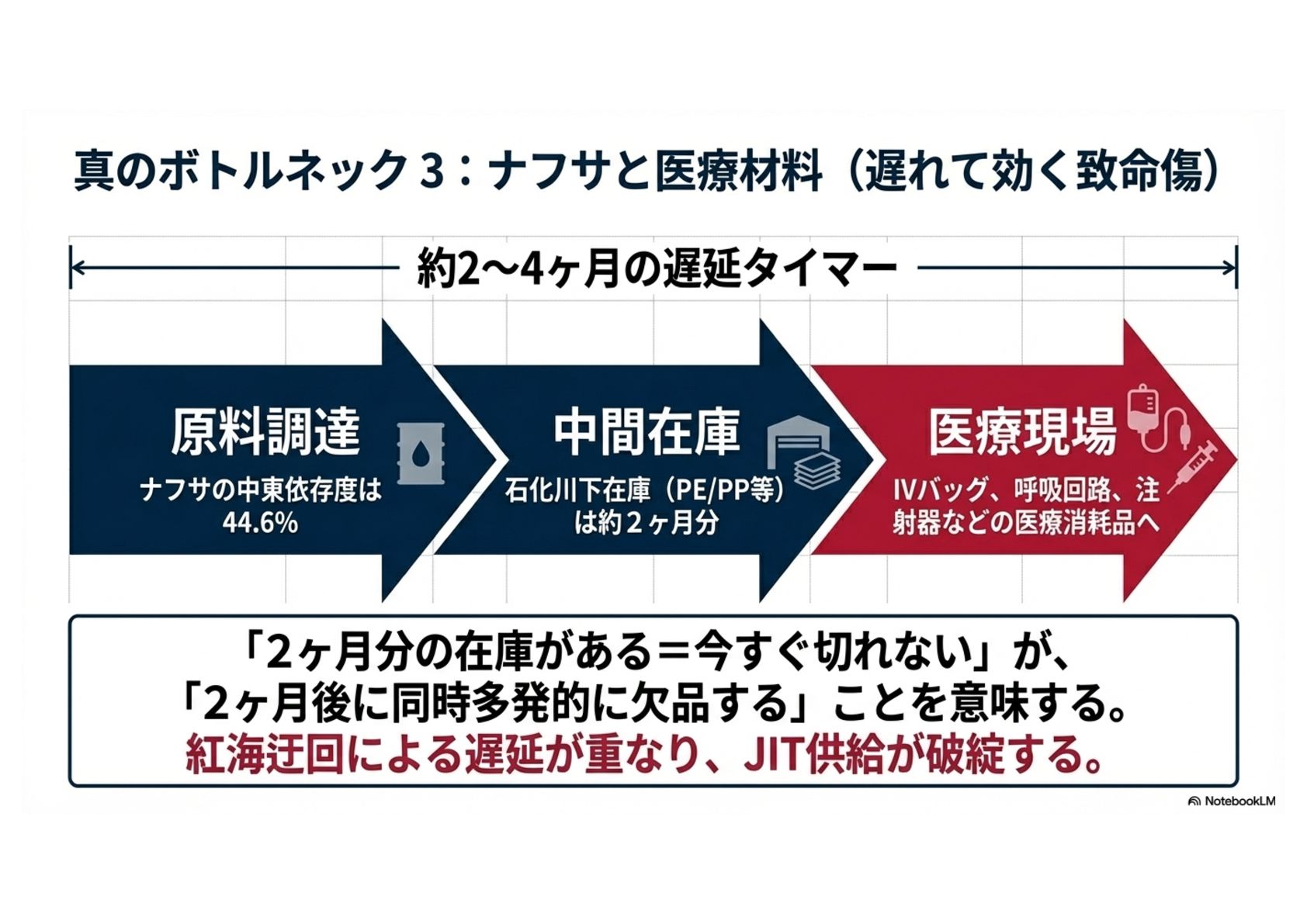 • ʮԘૉ10ʯશࠃҰͰͳ͘ɺදɾ҆ͱͯ͠ ݟͤΔ͖ • ʮܰ༉17.9 / ΨιϦϯ15.3ʯશࠃฏۉͷࡏݿΧ όʔͰ͋Γɺݱ౸ୡͰͳ͍ • ʮIVόοά͕ܽʯɺܽϦεΫ্͕ঢʹ͢Δͱա ͳஅఆΛආ͚ΒΕΔ ਪ͢Δݴ͍͑ 現行:国内需要の約2ヶ月分。紅海迂回による遅延(最大+45%)が重なり、IVバッグ等が欠品。