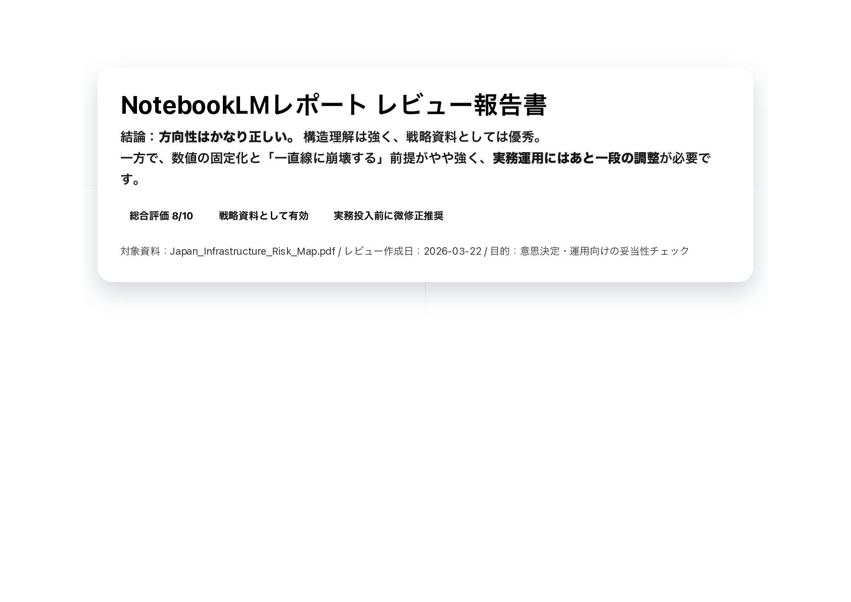 ରࢿྉɿJapan_Infrastructure_Risk_Map.pdf / ϨϏϡʔ࡞ɿ2026-03-22 / తɿҙࢥܾఆɾӡ༻͚ͷଥੑνΣοΫ