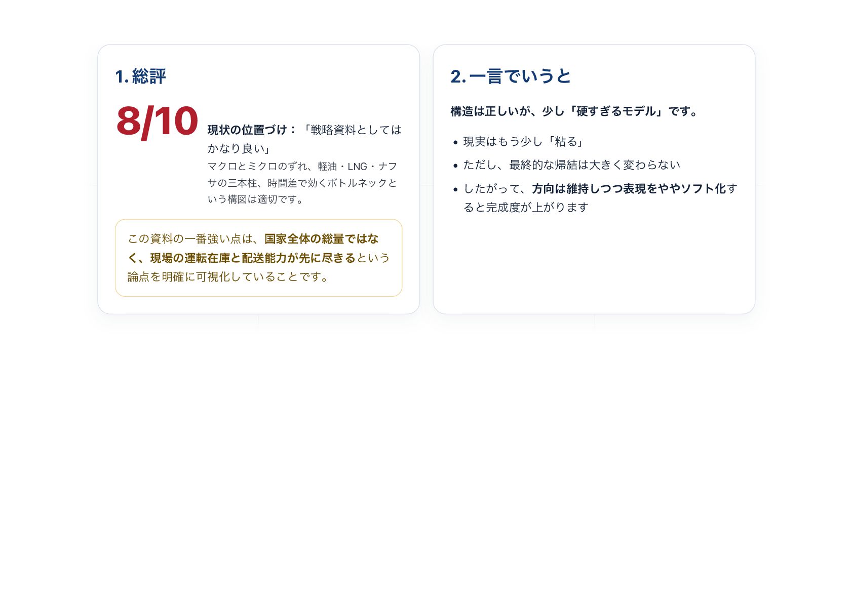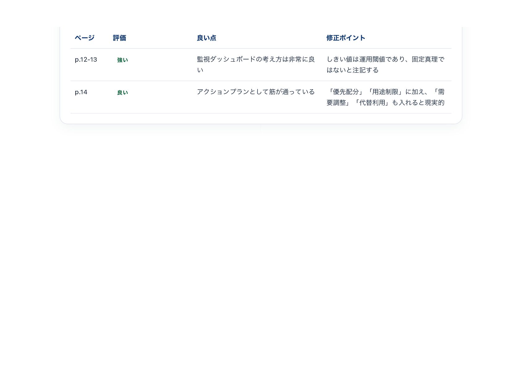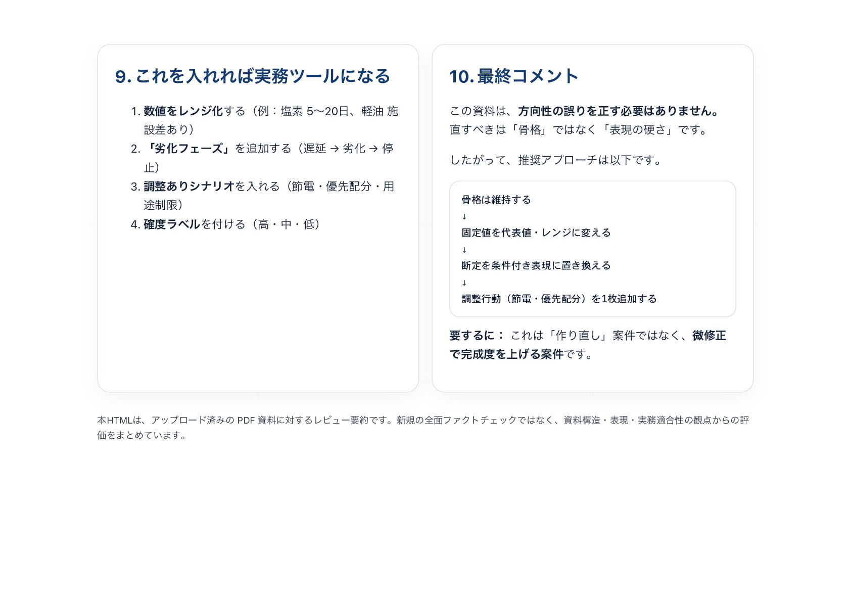 ྼԽ → ఀ ࢭʣ 3. ௐ͋ΓγφϦΦΛೖΕΔʢઅిɾ༏ઌɾ༻ ్੍ݶʣ 4. ֬ϥϕϧΛ͚Δʢߴɾதɾʣ 10. ࠷ऴίϝϯτ ͜ͷࢿྉɺํੑͷޡΓΛਖ਼͢ඞཁ͋Γ·ͤΜɻ ͖͢ʮࠎ֨ʯͰͳ͘ʮදݱͷߗ͞ʯͰ͢ɻ ͕ͨͬͯ͠ɺਪΞϓϩʔνҎԼͰ͢ɻ 骨格は維持する ↓ 固定値を代表値・レンジに変える ↓ 断定を条件付き表現に置き換える ↓ 調整行動(節電・優先配分)を1枚追加する ཁ͢Δʹɿ ͜Εʮ࡞Γ͠ʯҊ݅Ͱͳ͘ɺඍमਖ਼ ͰΛ্͛ΔҊ݅Ͱ͢ɻ ຊHTMLɺΞοϓϩʔυࡁΈͷ PDF ࢿྉʹର͢ΔϨϏϡʔཁͰ͢ɻ৽نͷશ໘ϑΝΫτνΣοΫͰͳ͘ɺࢿྉߏɾදݱɾ࣮ద߹ੑͷ؍͔Βͷධ ՁΛ·ͱΊ͍ͯ·͢ɻ