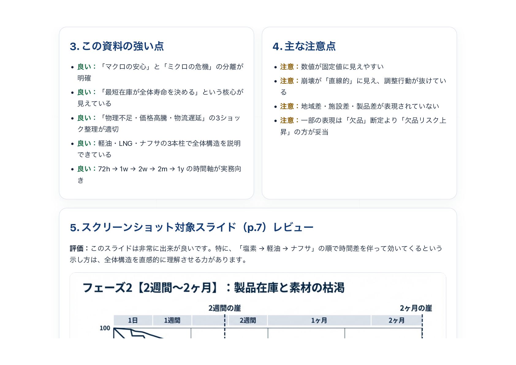 Ϋཧ͕ద • ྑ͍ɿܰ༉ɾLNGɾφϑαͷ3ຊபͰશମߏΛઆ໌ Ͱ͖͍ͯΔ • ྑ͍ɿ72h → 1w → 2w → 2m → 1y ͷ͕࣮࣌ؒ࣠ ͖ 4. ओͳҙ • ҙɿ͕ݻఆʹݟ͍͑͢ • ҙɿ่յ͕ʮઢతʯʹݟ͑ɺௐߦಈ͕ൈ͚͍ͯ Δ • ҙɿҬࠩɾࢪઃࠩɾ͕ࠩදݱ͞Ε͍ͯͳ͍ • ҙɿҰ෦ͷදݱʮܽʯஅఆΑΓʮܽϦεΫ্ ঢʯͷํ͕ଥ 5. εΫϦʔϯγϣοτରεϥΠυʢp.7ʣϨϏϡʔ ධՁɿ͜ͷεϥΠυඇৗʹग़དྷ͕ྑ͍Ͱ͢ɻಛʹɺʮԘૉ → ܰ༉ → φϑαʯͷॱͰ࣌ؒࠩΛͬͯޮ͍ͯ͘Δͱ͍͏ ࣔ͠ํɺશମߏΛײతʹཧղͤ͞Δྗ͕͋Γ·͢ɻ