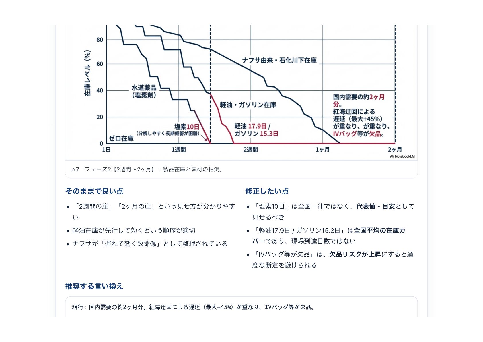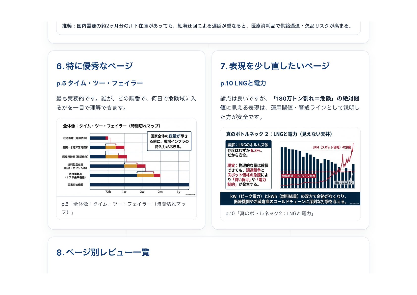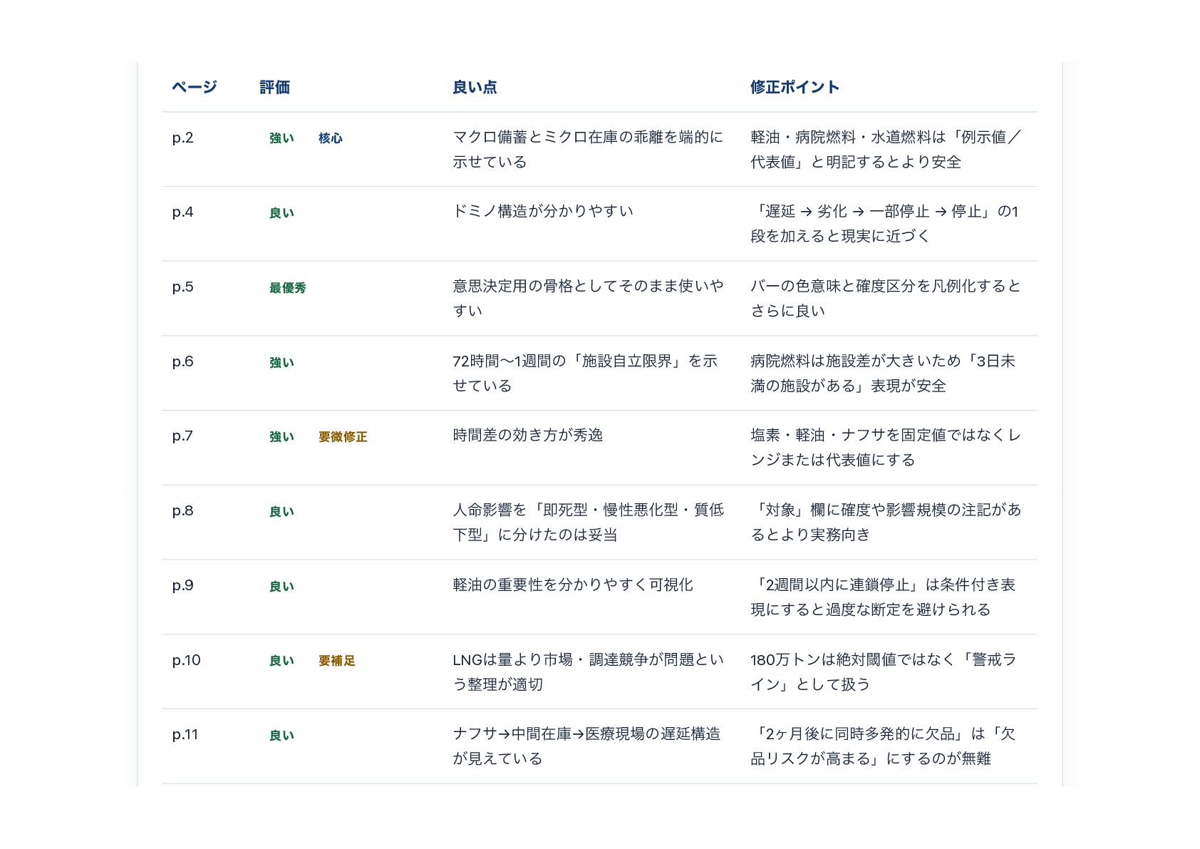දʯͱ໌ه͢ΔͱΑΓ҆શ p.4 ྑ͍ υϛϊߏ͕͔Γ͍͢ ʮԆ → ྼԽ → Ұ෦ఀࢭ → ఀࢭʯͷ1 ஈΛՃ͑Δͱݱ࣮ʹۙͮ͘ p.5 ࠷༏ल ҙࢥܾఆ༻ͷࠎ֨ͱͯͦ͠ͷ··͍ ͍͢ όʔͷ৭ҙຯͱ֬۠ΛຌྫԽ͢Δͱ ͞Βʹྑ͍ p.6 ڧ͍ 72࣌ؒʙ1िؒͷʮࢪઃཱࣗݶքʯΛࣔ ͍ͤͯΔ පӃ೩ྉࢪઃ͕ࠩେ͖͍ͨΊʮ3ະ ຬͷࢪઃ͕͋Δʯදݱ͕҆શ p.7 ڧ͍ ཁඍमਖ਼ ࣌ؒࠩͷޮ͖ํ͕लҳ Ԙૉɾܰ༉ɾφϑαΛݻఆͰͳ͘Ϩ ϯδ·ͨදʹ͢Δ p.8 ྑ͍ ਓ໋ӨڹΛʮଈࢮܕɾຫੑѱԽܕɾ࣭ Լܕʯʹ͚ͨͷଥ ʮରʯཝʹ֬Өڹنͷه͕͋ ΔͱΑΓ࣮͖ p.9 ྑ͍ ܰ༉ͷॏཁੑΛ͔Γ͘͢ՄࢹԽ ʮ2िؒҎʹ࿈ఀࢭʯ͖݅ද ݱʹ͢ΔͱաͳஅఆΛආ͚ΒΕΔ p.10 ྑ͍ ཁิ LNGྔΑΓࢢɾௐୡڝ૪͕ͱ͍ ͏ཧ͕ద 180ສτϯઈରᮢͰͳ͘ʮܯռϥ Πϯʯͱͯ͠ѻ͏ p.11 ྑ͍ φϑα→தؒࡏݿ→ҩྍݱͷԆߏ ͕ݟ͍͑ͯΔ ʮ2ϲ݄ޙʹಉ࣌ଟൃతʹܽʯʮܽ ϦεΫ͕ߴ·Δʯʹ͢Δͷ͕ແ
