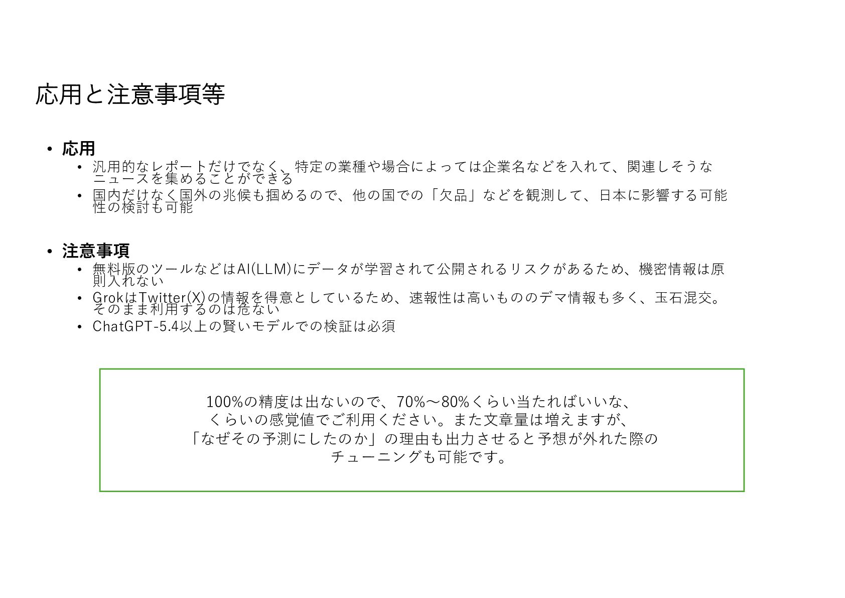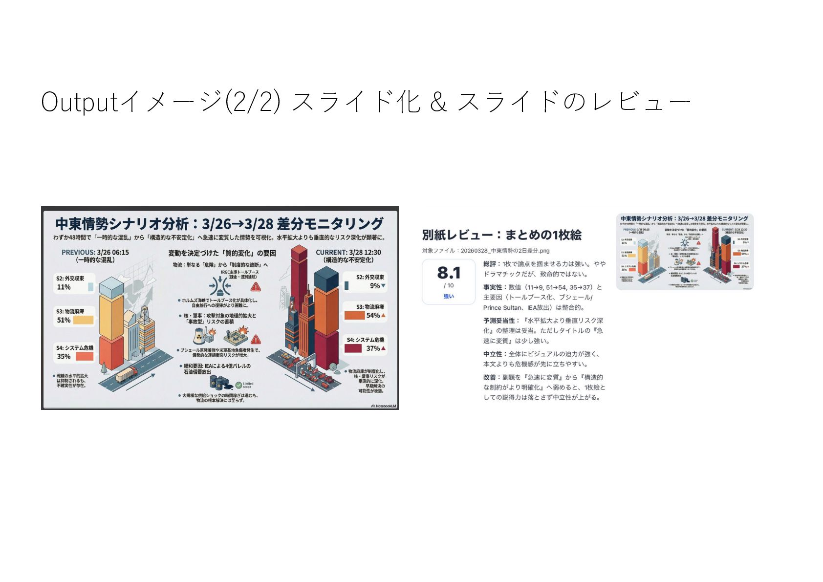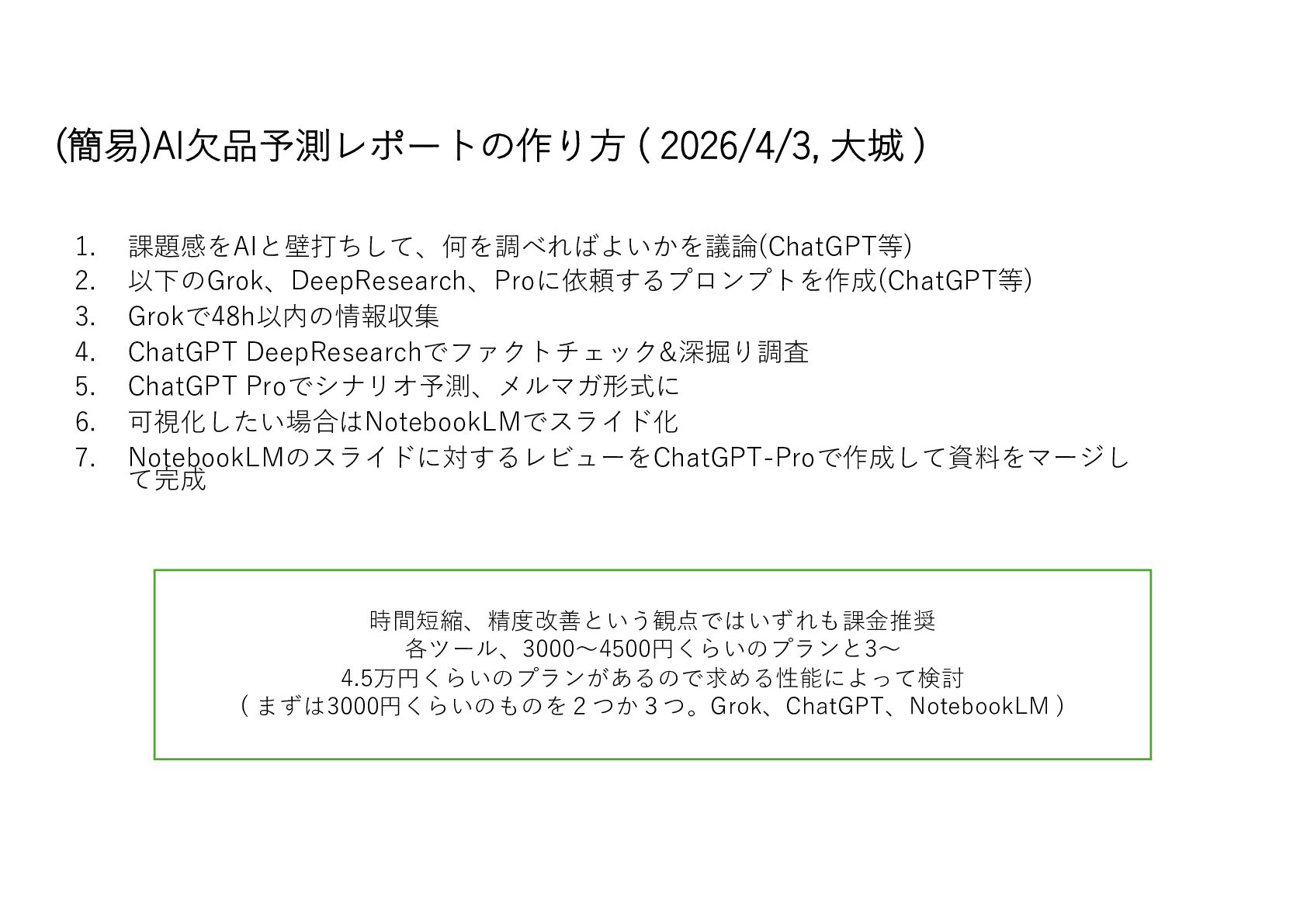 Grokで48h以内の情報収集 4. ChatGPT DeepResearchでファクトチェック&深掘り調査 5. ChatGPT Proでシナリオ予測、メルマガ形式に 6. 可視化したい場合はNotebookLMでスライド化 7. NotebookLMのスライドに対するレビューをChatGPT-Proで作成して資料をマージし て完成 時間短縮、精度改善という観点ではいずれも課⾦推奨 各ツール、3000〜4500円くらいのプランと3〜 4.5万円くらいのプランがあるので求める性能によって検討 ( まずは3000円くらいのものを2つか3つ。Grok、ChatGPT、NotebookLM )