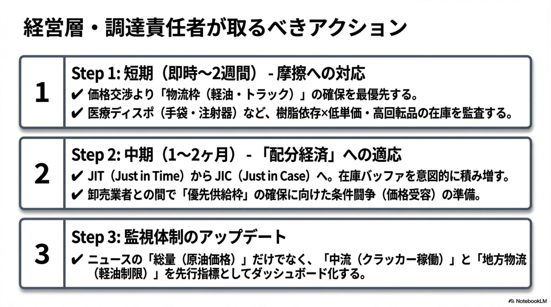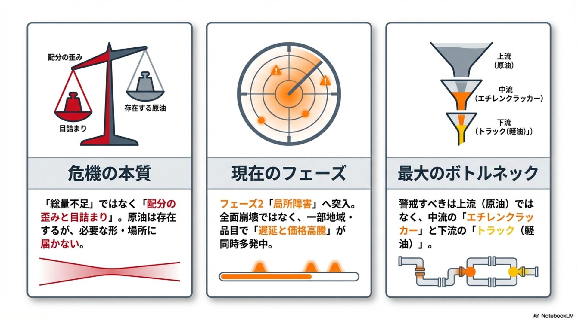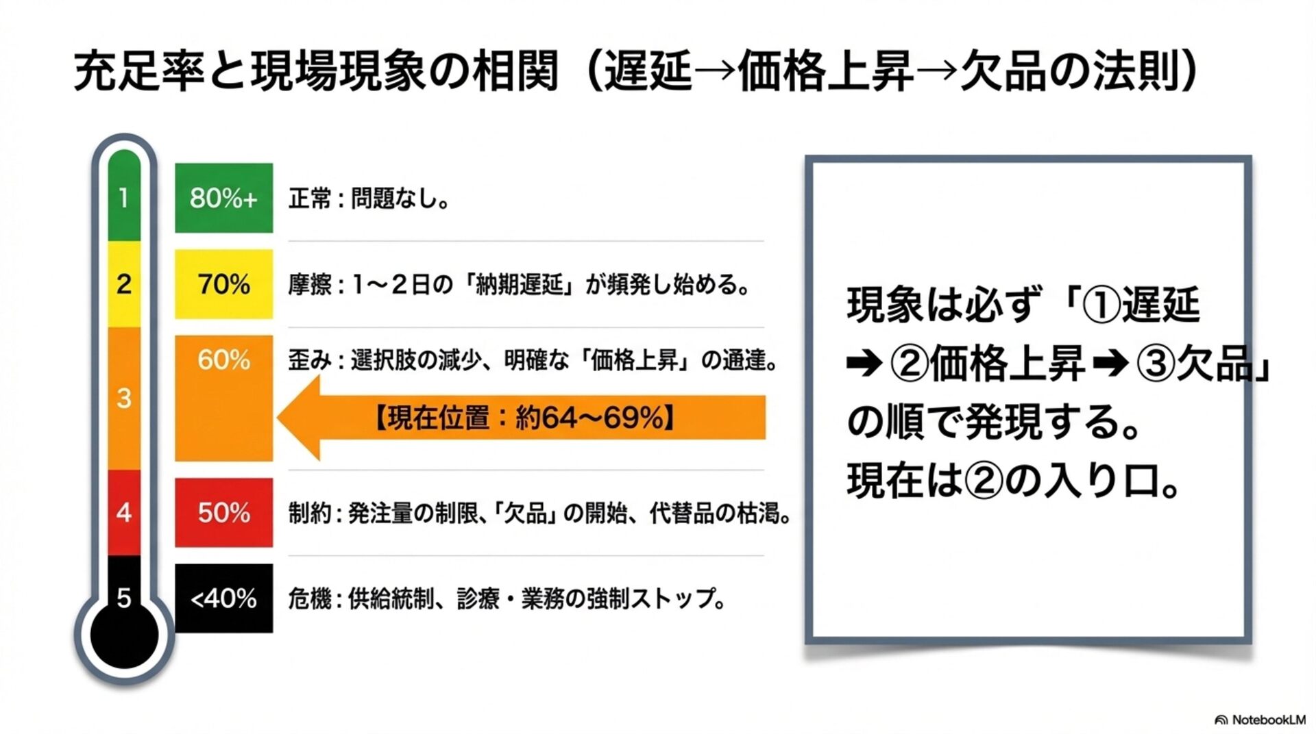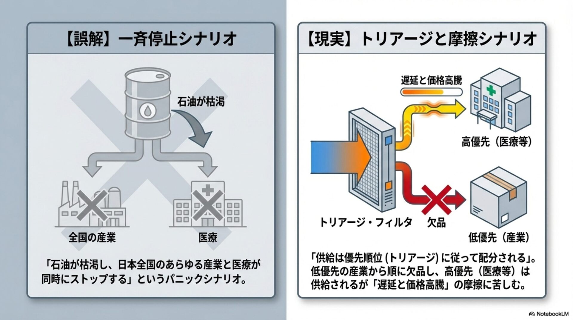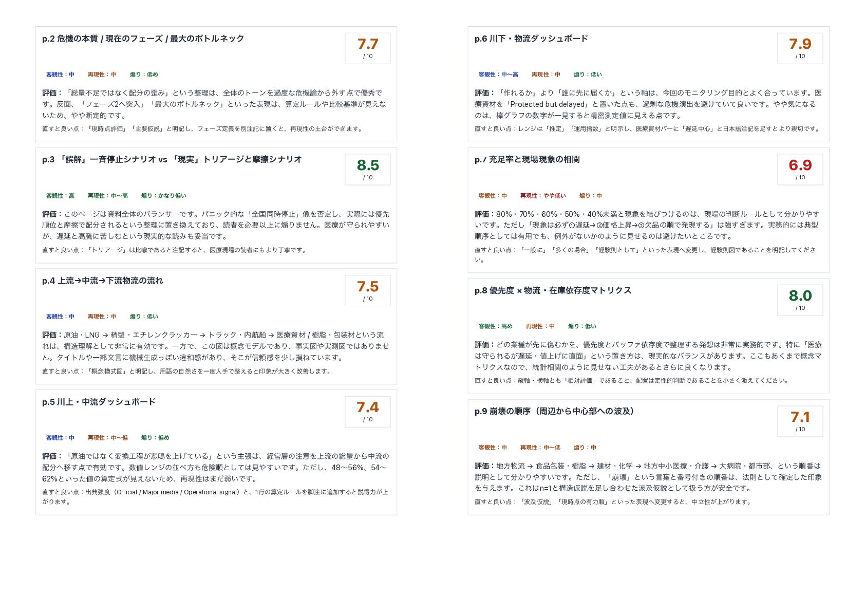 ࠶ݱੑɿத ἤΓɿΊ ධՁɿʮ૯ྔෆͰͳ͘ͷΈʯͱ͍͏ཧɺશମͷτʔϯΛաͳةػ͔Β֎͢Ͱ༏लͰ ͢ɻ໘ɺʮϑΣʔζ2ಥೖʯʮ࠷େͷϘτϧωοΫʯͱ͍ͬͨදݱɺࢉఆϧʔϧൺֱج४͕ݟ͑ͳ ͍ͨΊɺஅఆతͰ͢ɻ ͢ͱྑ͍ɿʮݱ࣌ධՁʯʮओཁԾઆʯͱ໌ه͠ɺϑΣʔζఆٛΛผهʹஔ͘ͱɺ࠶ݱੑͷ͕Ͱ͖·͢ɻ p.3 ʮޡղʯҰ੪ఀࢭγφϦΦ vs ʮݱ࣮ʯτϦΞʔδͱຎࡲγφϦΦ 8.5 / 10 ٬؍ੑɿߴ ࠶ݱੑɿதʙߴ ἤΓɿ͔ͳΓ͍ ධՁɿ͜ͷϖʔδࢿྉશମͷόϥϯαʔͰ͢ɻύχοΫతͳʮશࠃಉ࣌ఀࢭʯ૾Λ൱ఆ͠ɺ࣮ࡍʹ༏ઌ ॱҐͱຎࡲͰ͞ΕΔͱ͍͏ཧʹஔ͖͓͑ͯΓɺಡऀΛඞཁҎ্ʹἤΓ·ͤΜɻҩྍ͕कΒΕ͍͢ ͕ɺԆͱߴಅʹۤ͠Ήͱ͍͏ݱ࣮తͳಡΈଥͰ͢ɻ ͢ͱྑ͍ɿʮτϦΞʔδʯൺᄻͰ͋Δͱه͢ΔͱɺҩྍݱͷಡऀʹΑΓஸೡͰ͢ɻ p.4 ্ྲྀ→தྲྀ→ԼྲྀྲྀͷྲྀΕ 7.5 / 10 ٬؍ੑɿத ࠶ݱੑɿத ἤΓɿ͍ ධՁɿݪ༉ɾLNG → ਫ਼ɾΤνϨϯΫϥοΧʔ → τϥοΫɾߤધ → ҩྍࢿࡐ / थࢷɾแࡐͱ͍͏ྲྀ Εɺߏཧղͱͯ͠ඇৗʹ༗ޮͰ͢ɻҰํͰɺ͜ͷਤ֓೦ϞσϧͰ͋Γɺࣄ࣮ਤ࣮ଌਤͰ͋Γ·ͤ ΜɻλΠτϧҰ෦จݴʹػցੜͬΆ͍ҧײ͕͋Γɺ͕ͦ͜৴པײΛগ͠ଛͶ͍ͯ·͢ɻ ͢ͱྑ͍ɿʮ֓೦ࣜਤʯͱ໌ه͠ɺ༻ޠͷࣗવ͞ΛҰਓखͰ͑Δͱҹ͕େ͖͘վળ͠·͢ɻ p.5 ্ɾதྲྀμογϡϘʔυ 7.4 / 10 ٬؍ੑɿத ࠶ݱੑɿதʙ ἤΓɿΊ ධՁɿʮݪ༉Ͱͳ͘มఔ͕൵໐Λ্͍͛ͯΔʯͱ͍͏ओுɺܦӦͷҙΛ্ྲྀͷ૯ྔ͔Βதྲྀͷ Ҡ͢Ͱ༗ޮͰ͢ɻϨϯδͷฒํةݥॱͱͯ͠ݟ͍͢Ͱ͢ɻͨͩ͠ɺ48ʙ56%ɺ54ʙ 62%ͱ͍ͬͨͷࢉఆ͕ࣜݟ͑ͳ͍ͨΊɺ࠶ݱੑ·ͩऑ͍Ͱ͢ɻ ͢ͱྑ͍ɿग़యڧʢOfficial / Major media / Operational signalʣͱɺ1ߦͷࢉఆϧʔϧΛ٭ʹՃ͢Δͱઆಘྗ্͕ ͕Γ·͢ɻ p.6 ԼɾྲྀμογϡϘʔυ 7.9 / 10 ٬؍ੑɿதʙߴ ࠶ݱੑɿத ἤΓɿ͍ ධՁɿʮ࡞ΕΔ͔ʯΑΓʮ୭ʹઌʹಧ͔͘ʯͱ͍͏࣠ɺࠓճͷϞχλϦϯάతͱΑ͘߹͍ͬͯ·͢ɻҩ ྍࢿࡐΛʮProtected but delayedʯͱஔ͍ͨɺաͳةػԋग़Λආ͚͍ͯͯྑ͍Ͱ͢ɻؾʹͳΔ ͷɺάϥϑͷࣈ͕Ұݟ͢Δͱਫ਼ີଌఆʹݟ͑ΔͰ͢ɻ ͢ͱྑ͍ɿϨϯδʮਪఆʯʮӡ༻ࢦʯͱ໌ࣔ͠ɺҩྍࢿࡐόʔʹʮԆத৺ʯͱຊޠهΛ͢ͱΑΓͰ͢ɻ p.7 ॆͱݱݱͷ૬ؔ 6.9 / 10 ٬؍ੑɿத ࠶ݱੑɿ͍ ἤΓɿத ධՁɿ80%ɾ70%ɾ60%ɾ50%ɾ40%ະຬͱݱΛ݁ͼ͚ͭΔͷɺݱͷஅϧʔϧͱ͔ͯ͠Γ͢ ͍Ͱ͢ɻͨͩ͠ʮݱඞͣ①Ԇ→②Ձ্֨ঢ→③ܽͷॱͰൃݱ͢Δʯڧ͗͢·͢ɻ࣮తʹయܕ ॱংͱͯ͠༗༻Ͱɺྫ֎͕ͳ͍͔ͷΑ͏ʹݟͤΔͷආ͚͍ͨͱ͜ΖͰ͢ɻ ͢ͱྑ͍ɿʮҰൠʹʯʮଟ͘ͷ߹ʯʮܦݧଇͱͯ͠ʯͱ͍ͬͨදݱมߋ͠ɺܦݧଇਤͰ͋Δ͜ͱΛ໌هͯͩ͘͠͞ ͍ɻ p.8 ༏ઌ × ྲྀɾࡏݿґଘϚτϦΫε 8.0 / 10 ٬؍ੑɿߴΊ ࠶ݱੑɿத ἤΓɿ͍ ධՁɿͲͷۀछ͕ઌʹইΉ͔Λɺ༏ઌͱόοϑΝґଘͰཧ͢Δൃඇৗʹ࣮తͰ͢ɻಛʹʮҩྍ कΒΕΔ͕Ԇɾ্͛ʹ໘ʯͱ͍͏ஔ͖ํɺݱ࣮తͳόϥϯε͕͋Γ·͢ɻ͋͘͜͜·Ͱ֓೦Ϛ τϦΫεͳͷͰɺ౷ܭ૬ؔͷΑ͏ʹݟͤͳ͍͕͋Δͱ͞Βʹྑ͘ͳΓ·͢ɻ ͢ͱྑ͍ɿॎ࣠ɾԣ࣠ͱʮ૬ରධՁʯͰ͋Δ͜ͱɺஔఆੑతஅͰ͋Δ͜ͱΛখ͘͞ఴ͍͑ͯͩ͘͞ɻ p.9 ่յͷॱংʢपล͔Βத৺෦ͷٴʣ 7.1 / 10 ٬؍ੑɿத ࠶ݱੑɿதʙ ἤΓɿத ධՁɿํྲྀ → ৯แɾथࢷ → ݐࡐɾԽֶ → ํதখҩྍɾհޢ → େපӃɾࢢ෦ɺͱ͍͏ॱ൪ આ໌ͱ͔ͯ͠Γ͍͢Ͱ͢ɻͨͩ͠ɺʮ่յʯͱ͍͏ݴ༿ͱ൪߸͖ͷॱ൪ɺ๏ଇͱͯ֬͠ఆͨ͠ҹ Λ༩͑·͢ɻ͜Εn=1ͱߏԾઆΛ͠߹ΘͤͨٴԾઆͱͯ͠ѻ͏ํ͕҆શͰ͢ɻ ͢ͱྑ͍ɿʮٴԾઆʯʮݱ࣌ͷ༗ྗॱʯͱ͍ͬͨදݱมߋ͢Δͱɺதཱੑ্͕͕Γ·͢ɻ