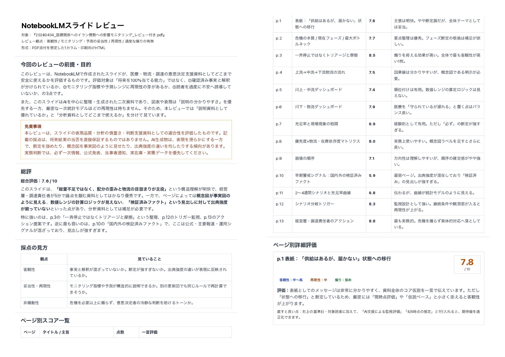 ܗࣜɿPDFఴΛఆͨ͠1ΧϥϜɾҹ͚HTML ࠓճͷϨϏϡʔͷલఏɾత ͜ͷϨϏϡʔɺNotebookLMͰ࡞͞ΕͨεϥΠυ͕ɺҩྍɾྲྀɾௐୡͷҙࢥܾఆࢧԉࢿྉͱͯ͠Ͳ͜·Ͱ ҆શʹ͑Δ͔ΛධՁ͢ΔͷͰ͢ɻධՁରʮকདྷΛ100%ͯΔೳྗʯͰͳ͘ɺ①֬ೝࡁΈࣄ࣮ͱղऍ ͕͚ΒΕ͍ͯΔ͔ɺ②ϞχλϦϯάࢦඪ༧ଌϨϯδʹ࠶ݱੑͷժ͕͋Δ͔ɺ③ಡऀΛաʹෆ҆༠ಋͯ͠ ͍ͳ͍͔ɺͷ3Ͱ͢ɻ ·ͨɺ͜ͷεϥΠυAIΛத৺ʹཧɾੜ͞Εͨೋ࣍ࢿྉͰ͋Γɺਤදදݱʮઆ໌ͷ͔Γ͢͞ʯΛ༏ ઌ͢ΔҰํɺݫີͳҰ࣍౷ܭϞσϧ΄Ͳͷ࠶ݱੑ࣋ͪ·ͤΜɻͦͷͨΊɺຊϨϏϡʔͰʮઆ໌ࢿྉͱͯ͠ ༏Ε͍ͯΔ͔ʯͱʮੳࢿྉͱͯ͠Ͳ͜·Ͱ͑Δ͔ʯΛ͚ͯݟ͍ͯ·͢ɻ ໔ࣄ߲ ຊϨϏϡʔɺεϥΠυͷදݱ࣭ɾੳͷ৻ॏ͞ɾஅࢧԉࢿྉͱͯ͠ͷద߹ੑΛධՁͨ͠ͷͰ͢ɻه ࡌͷ࠾ɺকདྷ݁Ռͷ൱Λอূ͢ΔͷͰ͋Γ·ͤΜɻAIੜɺදݱΛΒ͔ʹ͢ΔҰํ ͰɺஅఆΛڧΊͨΓɺ֓೦ਤΛࣄ࣮ਤͷΑ͏ʹݟͤͨΓɺग़యڧͷҧ͍Λۉͨ͠Γ͢Δ͕͋Γ·͢ɻ ࣮அͰɺඞͣҰ࣍ใɺެࣜൃදɺࣄऀ௨ɺ࣮ࡏݿɾ࣮धσʔλΛ༏ઌ͍ͯͩ͘͠͞ɻ ૯ධ ૯߹ධՁɿ7.6 / 10 ͜ͷεϥΠυɺʮ૯ྔෆͰͳ͘ɺͷΈͱྲྀͷ٧·Γ͕ओʯͱ͍͏ߏཧղ͕໌շͰɺܦӦ ɾௐୡऀ͕5ͰΛ௫Ήࢿྉͱ͔ͯ͠ͳΓ༏लͰ͢ɻҰํͰɺϖʔδʹΑͬͯ֓೦ਤ͕ࣄ࣮ਤͷ Α͏ʹݟ͑ΔɺϨϯδͷܭࢉϩδοΫ͕ݟ͑ͳ͍ɺʮݕূࡁΈϑΝΫτʯͱ͍͏ݟग़͠ʹରͯ͠ग़యڧ ͕ἧ͍ͬͯͳ͍ͱ͍͕ͬͨ͋Γɺੳࢿྉͱͯ͠ิ͕ඞཁͰ͢ɻ ಛʹڧ͍ͷɺp.3ͷʮҰ੪ఀࢭͰͳ͘τϦΞʔδͱຎࡲʯͱ͍͏ཧɺp.12ͷτϦΨʔࢹɺp.13ͷΞΫ γϣϯఏҊͰ͢ɻٯʹ࠷ऑ͍ͷɺp.10ͷʮࠃ֎ͷݕূࡁΈϑΝΫτʯͰɺ͜͜ެࣜɾओཁใಓɾӡ༻γ άφϧ͕͓ࠞͬͯ͟Γɺݟग़͕͠ڧ͗͢·͢ɻ ࠾ͷݟํ ؍ ݟ͍ͯΔ͜ͱ ٬؍ੑ ࣄ࣮ͱղऍ͕͍ࠞͬͯ͟ͳ͍͔ɻஅఆ͕ڧ͗͢ͳ͍͔ɻग़యڧͷҧ͍͕දݱʹө͞Ε ͍ͯΔ͔ɻ ଥੑɾ࠶ݱੑ ϞχλϦϯάࢦඪ༧ଌ͕ߏతʹઆ໌Ͱ͖Δ͔ɻผͷߋ৽ճͰಉ͡ϧʔϧͰ࠶ܭࢉͰ ͖ͦ͏͔ɻ ඇἤಈੑ ةػΛඞཁҎ্ʹἤΒͣɺҙࢥܾఆऀͷྫྷ੩ͳஅΛॿ͚Δτʔϯ͔ɻ ϖʔδผείΞҰཡ ϖʔδ λΠτϧ / ओࢫ ҰݴධՁ p.1 දࢴɿʮڙڅ͋Δ͕ɺಧ͔ͳ͍ʯঢ় ଶͷҠߦ 7.8 ओு໌շɻஅఆௐ͕ͩɺશମςʔϚͱͯ͠ ଥɻ p.2 ةػͷຊ࣭ / ݱࡏϑΣʔζ / ࠷େϘτ ϧωοΫ 7.7 ཁཧ༏लɻϑΣʔζஅఆͷࠜڌิ͕ཉ ͍͠ɻ p.3 Ұ੪ఀࢭͰͳ͘τϦΞʔδͱຎࡲ 8.5 ἤΓΛ͑ΔޮՌ͕ߴ͍ɻશମͰ࠷٬؍ੑ͕ߴ ͍1ຕɻ p.4 ্ྲྀ→தྲྀ→ԼྲྀྲྀͷྲྀΕ 7.5 ҼՌઢ͔Γ͍͕͢ɺ֓೦ਤͰ͋Δ໌͕ࣔඞ ཁɻ p.5 ্ɾதྲྀμογϡϘʔυ 7.4 ॱҐ͚༗༻ɻϨϯδͷࢉఆϩδοΫݟ ͑ͳ͍ɻ p.6 ԼɾྲྀμογϡϘʔυ 7.9 ҩྍΛʮकΒΕ͍ͯΔ͕ΕΔʯͱஔ͘όϥ ϯεྑ͍ɻ p.7 ॆͱݱݱͷ૬ؔ 6.9 ܦݧଇͱͯ͠༗༻ɻͨͩ͠ʮඞͣʯͷஅఆ͕ڧ͢ ͗Δɻ p.8 ༏ઌ×ྲྀɾࡏݿґଘϚτϦΫε 8.0 ্࣮͍͍͢ɻ֓೦ਤϥϕϧΛ͢ͱ͞Βʹ ྑ͍ɻ p.9 ่յͷॱং 7.1 ํੑཧղ͍͕͢͠ɺॱংͷ֬ఆײ͕ڧ ͍ɻ p.10 ૣظܯռγάφϧɿࠃ֎ͷݕূࡁΈ ϑΝΫτ 5.9 ࠷ऑϖʔδɻग़యڧ͕ࠞࡏ͓ͯ͠Γʮݕূࡁ Έʯͷݟग़͕͠ڧ͗͢Δɻ p.11 2ʙ4िؒγφϦΦͱॆۂઢ 6.8 ΘΔ͕ɺۂઢ͕౷ܭϞσϧͷΑ͏ʹݟ͑Δɻ p.12 γφϦΦذτϦΨʔ 8.3 ࢹઃܭͱͯ͠ڧ͍ɻܧଓ݅؍ଌ૭͕ೖΔͱ ࠶ݱੑ্͕͕Δɻ p.13 ܦӦɾௐୡऀͷΞΫγϣϯ 8.8 ࠷࣮తɻةػΛἤΒͣ۩ମతରԠམͱͯ͠ ͍Δɻ ϖʔδผৄࡉධՁ p.1 දࢴɿʮڙڅ͋Δ͕ɺಧ͔ͳ͍ʯঢ়ଶͷҠߦ 7.8 / 10 ٬؍ੑɿதʙߴ ࠶ݱੑɿத ἤΓɿΊ ධՁɿදࢴͱͯ͠ͷϝοηʔδඇৗʹ͔Γ͘͢ɺࢿྉશମͷίΞԾઆΛҰݴͰ͍͑ͯ·͢ɻͨͩ͠ ʮঢ়ଶͷҠߦʯͱஅఆ͍ͯ͠ΔͨΊɺݫີʹʮݱ࣌ධՁʯʮԾઆϕʔεʯͱখ͘͞ఴ͑Δͱ٬؍ੑ ্͕͕Γ·͢ɻ ͢ͱྑ͍ɿӈ্ͷج४ɾରಡऀʹՃ͑ͯɺʮAIࢧԉʹΑΔࢹධՁʯʮ4/4࣌ͷਪఆʯͱ1ߦೖΕΔͱɺظΛద ਖ਼ԽͰ͖·͢ɻ