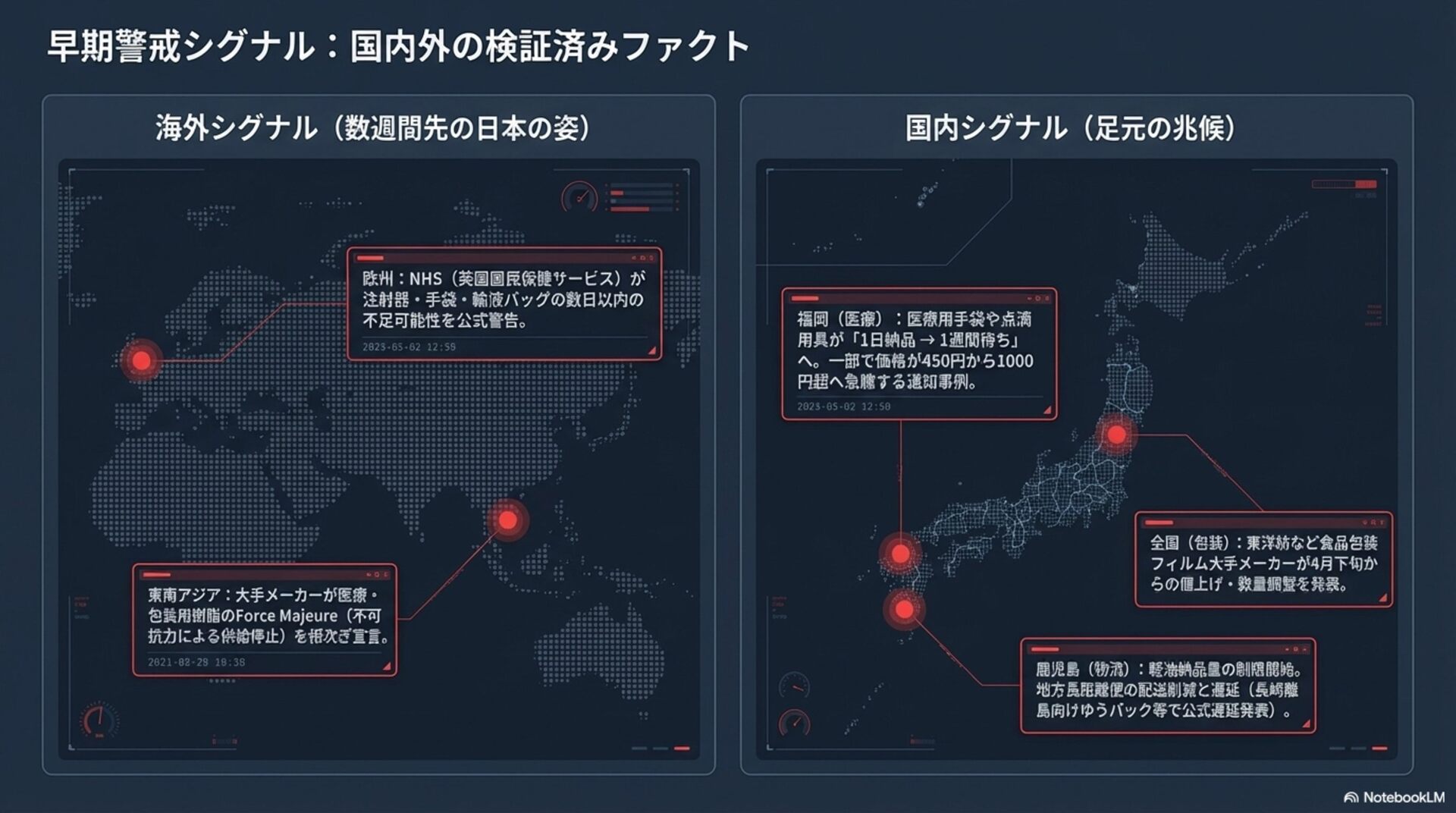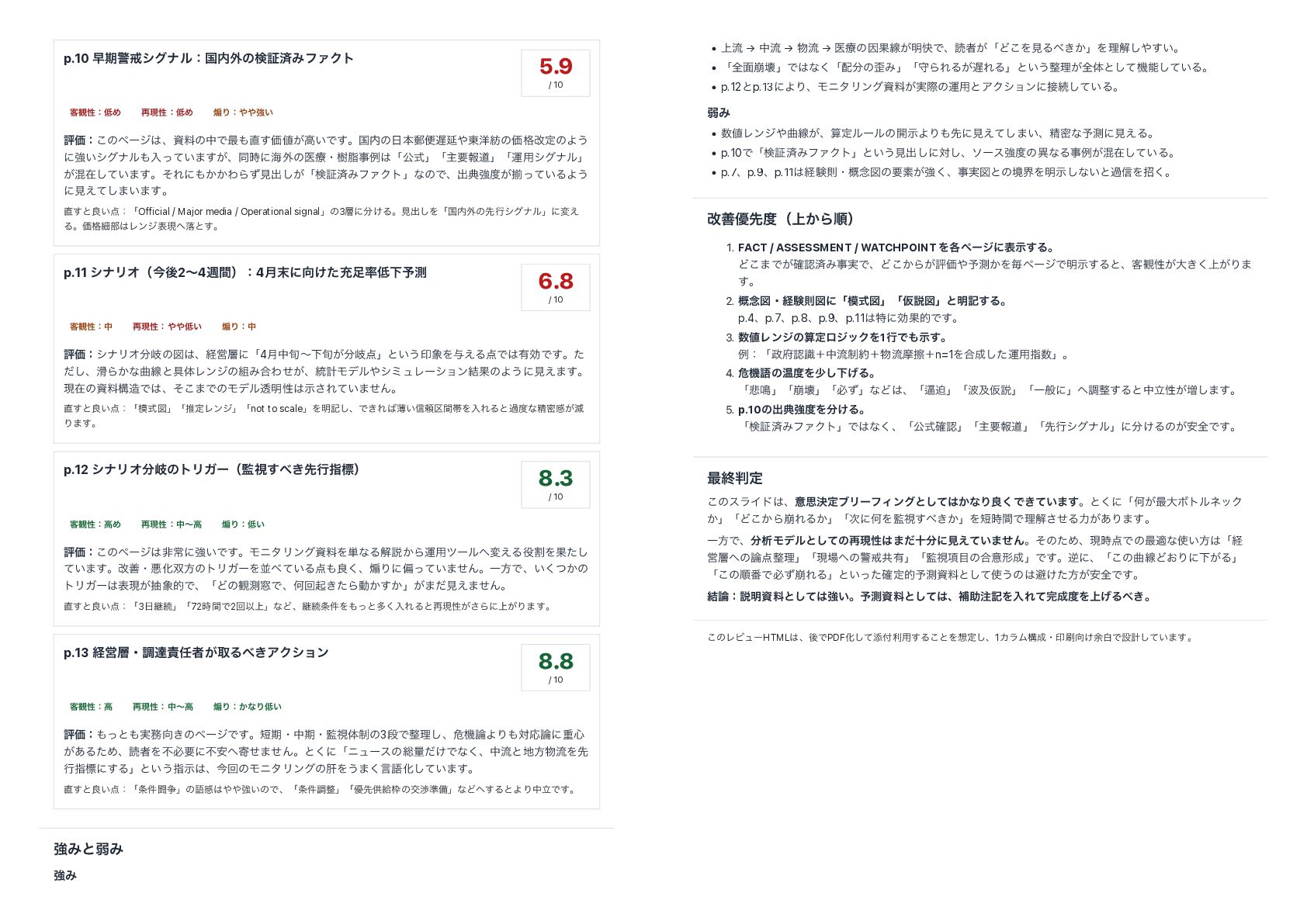 ͕ࠞࡏ͍ͯ͠·͢ɻͦΕʹ͔͔ΘΒͣݟग़͕͠ʮݕূࡁΈϑΝΫτʯͳͷͰɺग़యڧ͕ἧ͍ͬͯΔΑ͏ ʹݟ͑ͯ͠·͍·͢ɻ ͢ͱྑ͍ɿʮOfficial / Major media / Operational signalʯͷ3ʹ͚Δɻݟग़͠Λʮࠃ֎ͷઌߦγάφϧʯʹม͑ ΔɻՁ֨ࡉ෦Ϩϯδදݱམͱ͢ɻ p.11 γφϦΦʢࠓޙ2ʙ4िؒʣɿ4݄ʹ͚ͨॆԼ༧ଌ 6.8 / 10 ٬؍ੑɿத ࠶ݱੑɿ͍ ἤΓɿத ධՁɿγφϦΦذͷਤɺܦӦʹʮ4݄த०ʙԼ०͕ذʯͱ͍͏ҹΛ༩͑ΔͰ༗ޮͰ͢ɻͨ ͩ͠ɺΒ͔ͳۂઢͱ۩ମϨϯδͷΈ߹Θ͕ͤɺ౷ܭϞσϧγϛϡϨʔγϣϯ݁ՌͷΑ͏ʹݟ͑·͢ɻ ݱࡏͷࢿྉߏͰɺͦ͜·ͰͷϞσϧಁ໌ੑࣔ͞Ε͍ͯ·ͤΜɻ ͢ͱྑ͍ɿʮࣜਤʯʮਪఆϨϯδʯʮnot to scaleʯΛ໌ه͠ɺͰ͖Εബ͍৴པ۠ؒଳΛೖΕΔͱաͳਫ਼ີײ͕ݮ Γ·͢ɻ p.12 γφϦΦذͷτϦΨʔʢࢹ͖͢ઌߦࢦඪʣ 8.3 / 10 ٬؍ੑɿߴΊ ࠶ݱੑɿதʙߴ ἤΓɿ͍ ධՁɿ͜ͷϖʔδඇৗʹڧ͍Ͱ͢ɻϞχλϦϯάࢿྉΛ୯ͳΔղઆ͔Βӡ༻πʔϧม͑ΔׂΛՌͨ͠ ͍ͯ·͢ɻվળɾѱԽํͷτϦΨʔΛฒ͍ͯΔྑ͘ɺἤΓʹภ͍ͬͯ·ͤΜɻҰํͰɺ͍͔ͭ͘ͷ τϦΨʔදݱ͕நతͰɺʮͲͷ؍ଌ૭ͰɺԿճى͖ͨΒಈ͔͔͢ʯ͕·ͩݟ͑·ͤΜɻ ͢ͱྑ͍ɿʮ3ܧଓʯʮ72࣌ؒͰ2ճҎ্ʯͳͲɺܧଓ݅Λͬͱଟ͘ೖΕΔͱ࠶ݱੑ͕͞Βʹ্͕Γ·͢ɻ p.13 ܦӦɾௐୡऀ͕औΔ͖ΞΫγϣϯ 8.8 / 10 ٬؍ੑɿߴ ࠶ݱੑɿதʙߴ ἤΓɿ͔ͳΓ͍ ධՁɿͬͱ࣮͖ͷϖʔδͰ͢ɻظɾதظɾࢹମ੍ͷ3ஈͰཧ͠ɺةػΑΓରԠʹॏ৺ ͕͋ΔͨΊɺಡऀΛෆඞཁʹෆ҆دͤ·ͤΜɻͱ͘ʹʮχϡʔεͷ૯ྔ͚ͩͰͳ͘ɺதྲྀͱํྲྀΛઌ ߦࢦඪʹ͢Δʯͱ͍͏ࢦࣔɺࠓճͷϞχλϦϯάͷ؊Λ͏·͘ݴޠԽ͍ͯ͠·͢ɻ ͢ͱྑ͍ɿʮ݅ಆ૪ʯͷޠײڧ͍ͷͰɺʮ݅ௐʯʮ༏ઌڙڅͷަব४උʯͳͲ͢ΔͱΑΓதཱͰ͢ɻ ڧΈͱऑΈ ڧΈ • ্ྲྀ → தྲྀ → ྲྀ → ҩྍͷҼՌઢ͕໌շͰɺಡऀ͕ʮͲ͜ΛݟΔ͖͔ʯΛཧղ͍͢͠ɻ • ʮશ໘่յʯͰͳ͘ʮͷΈʯʮकΒΕΔ͕ΕΔʯͱ͍͏ཧ͕શମͱͯ͠ػೳ͍ͯ͠Δɻ • p.12ͱp.13ʹΑΓɺϞχλϦϯάࢿྉ͕࣮ࡍͷӡ༻ͱΞΫγϣϯʹଓ͍ͯ͠Δɻ ऑΈ • Ϩϯδۂઢ͕ɺࢉఆϧʔϧͷ։ࣔΑΓઌʹݟ͑ͯ͠·͍ɺਫ਼ີͳ༧ଌʹݟ͑Δɻ • p.10ͰʮݕূࡁΈϑΝΫτʯͱ͍͏ݟग़͠ʹର͠ɺιʔεڧͷҟͳΔࣄྫ͕ࠞࡏ͍ͯ͠Δɻ • p.7ɺp.9ɺp.11ܦݧଇɾ֓೦ਤͷཁૉ͕ڧ͘ɺࣄ࣮ਤͱͷڥքΛ໌ࣔ͠ͳ͍ͱա৴Λট͘ɻ վળ༏ઌʢ্͔Βॱʣ 1. FACT / ASSESSMENT / WATCHPOINT Λ֤ϖʔδʹදࣔ͢Δɻ Ͳ͜·Ͱ͕֬ೝࡁΈࣄ࣮ͰɺͲ͔͜Β͕ධՁ༧ଌ͔ΛຖϖʔδͰ໌ࣔ͢Δͱɺ٬؍ੑ͕େ্͖͕͘Γ· ͢ɻ 2. ֓೦ਤɾܦݧଇਤʹʮࣜਤʯʮԾઆਤʯͱ໌ه͢Δɻ p.4ɺp.7ɺp.8ɺp.9ɺp.11ಛʹޮՌతͰ͢ɻ 3. ϨϯδͷࢉఆϩδοΫΛ1ߦͰࣔ͢ɻ ྫɿʮೝࣝʴதྲ੍ྀʴྲྀຎࡲʴn=1Λ߹ͨ͠ӡ༻ࢦʯɻ 4. ةػޠͷԹΛগ͠Լ͛Δɻ ʮ൵໐ʯʮ่յʯʮඞͣʯͳͲɺʮṧഭʯʮٴԾઆʯʮҰൠʹʯௐ͢Δͱதཱੑ͕૿͠·͢ɻ 5. p.10ͷग़యڧΛ͚Δɻ ʮݕূࡁΈϑΝΫτʯͰͳ͘ɺʮެࣜ֬ೝʯʮओཁใಓʯʮઌߦγάφϧʯʹ͚Δͷ͕҆શͰ͢ɻ ࠷ऴఆ ͜ͷεϥΠυɺҙࢥܾఆϒϦʔϑΟϯάͱ͔ͯ͠ͳΓྑ͘Ͱ͖͍ͯ·͢ɻͱ͘ʹʮԿ͕࠷େϘτϧωοΫ ͔ʯʮͲ͔͜Β่ΕΔ͔ʯʮ࣍ʹԿΛࢹ͖͔͢ʯΛ࣌ؒͰཧղͤ͞Δྗ͕͋Γ·͢ɻ ҰํͰɺੳϞσϧͱͯ͠ͷ࠶ݱੑ·ͩेʹݟ͍͑ͯ·ͤΜɻͦͷͨΊɺݱ࣌Ͱͷ࠷దͳ͍ํʮܦ Ӧͷཧʯʮݱͷܯռڞ༗ʯʮࢹ߲ͷ߹ҙܗʯͰ͢ɻٯʹɺʮ͜ͷۂઢͲ͓ΓʹԼ͕Δʯ ʮ͜ͷॱ൪Ͱඞ่ͣΕΔʯͱ͍ͬͨ֬ఆత༧ଌࢿྉͱͯ͠͏ͷආ͚ͨํ͕҆શͰ͢ɻ ݁ɿઆ໌ࢿྉͱͯ͠ڧ͍ɻ༧ଌࢿྉͱͯ͠ɺิॿهΛೖΕͯΛ্͛Δ͖ɻ ͜ͷϨϏϡʔHTMLɺޙͰPDFԽͯ͠ఴར༻͢Δ͜ͱΛఆ͠ɺ1ΧϥϜߏɾҹ͚༨നͰઃܭ͍ͯ͠·͢ɻ