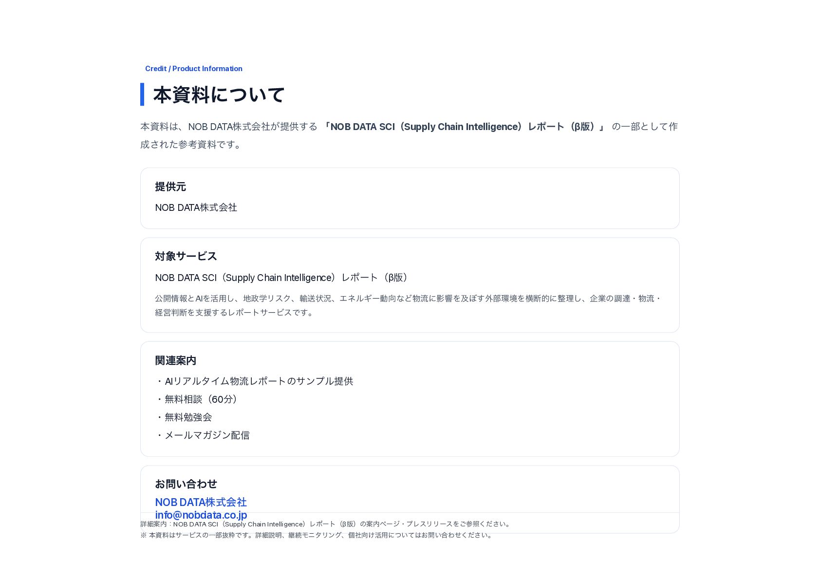 Chain IntelligenceʣϨϙʔτʢβ൛ʣʯ ͷҰ෦ͱͯ͠࡞ ͞ΕͨࢀߟࢿྉͰ͢ɻ ఏڙݩ NOB DATAגࣜձࣾ ରαʔϏε NOB DATA SCIʢSupply Chain IntelligenceʣϨϙʔτʢβ൛ʣ ެ։ใͱAIΛ׆༻͠ɺֶϦεΫɺ༌ૹঢ়گɺΤωϧΪʔಈͳͲྲྀʹӨڹΛٴ΅͢֎෦ڥΛԣஅతʹཧ͠ɺاۀͷௐୡɾྲྀɾ ܦӦஅΛࢧԉ͢ΔϨϙʔταʔϏεͰ͢ɻ ؔ࿈Ҋ ɾAIϦΞϧλΠϜྲྀϨϙʔτͷαϯϓϧఏڙ ɾແྉ૬ஊʢ60ʣ ɾແྉษڧձ ɾϝʔϧϚΨδϯ৴ ͓͍߹Θͤ NOB DATAגࣜձࣾ