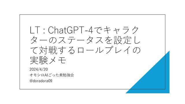 LT : ChatGPT-4でキャラク ターのステータスを設定し て対戦するロールプレイの 実験メモ 2024/4/20 オモシロAIごった煮勉強会 @doradora09