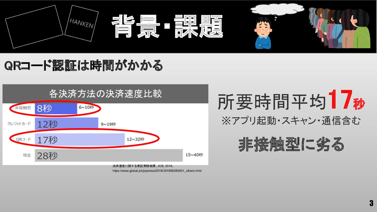 背景・課題 所要時間平均17秒 ※アプリ起動・スキャン・通信含む 非接触型に劣る QRコード認証は時間がかかる 各決済方法の決済速度比較 決済速度に関する実証実験結果, JCB,