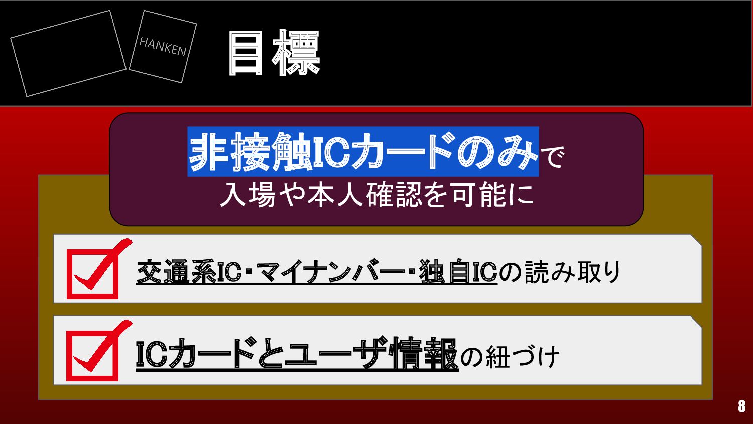 目標 非接触ICカードのみで 入場や本人確認を可能に 交通系IC・マイナンバー・独自ICの読み取り ICカードとユーザ情報の紐づけ 8