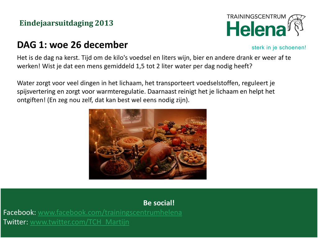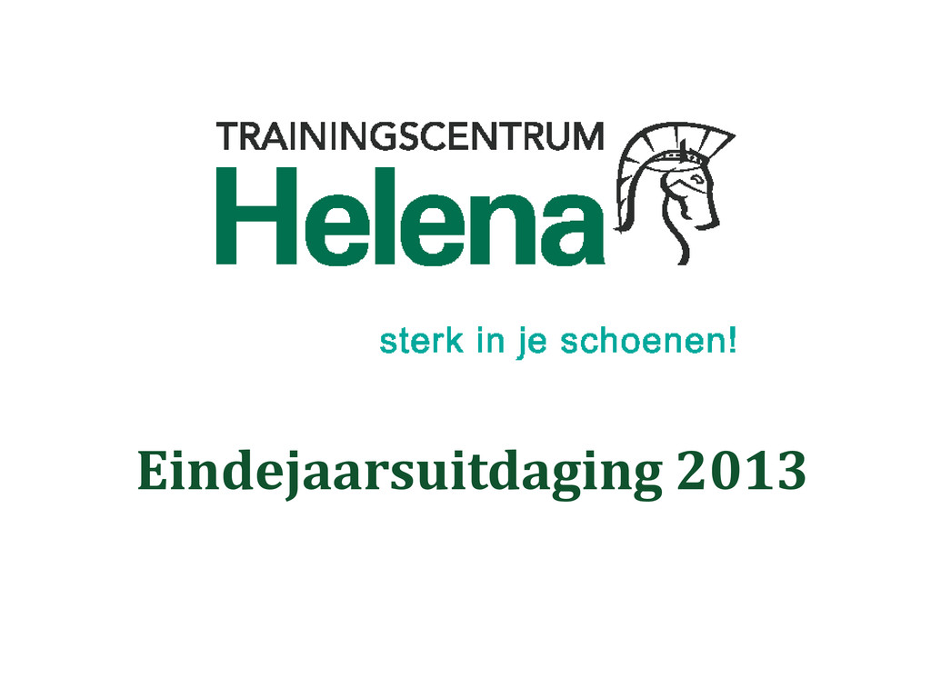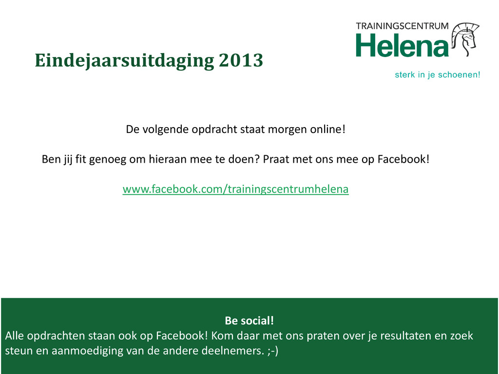met ons praten over je resultaten en zoek steun en aanmoediging van de andere deelnemers. ;-) Eindejaarsuitdaging 2013 De volgende opdracht staat morgen online! Ben jij fit genoeg om hieraan mee te doen? Praat met ons mee op Facebook! www.facebook.com/trainingscentrumhelena