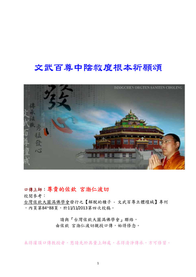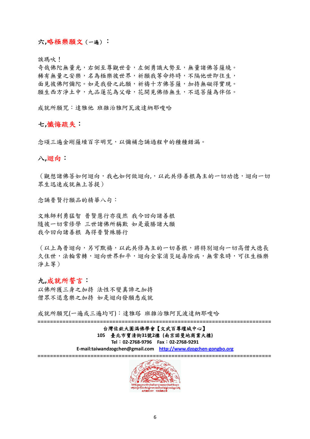 (一遍 一遍 一遍 一遍) ) ) ): : : : 誒瑪吙! 奇哉佛陀無量光,右側至尊觀世音,左側勇識大勢至,無量諸佛菩薩繞。 稀有無量之安樂,名為極樂彼世界,祈願我等命終時,不隔他世即往生, 面見彼佛阿彌陀。如是我發之此願,祈禱十方佛菩薩,加持無礙得實現。 願生西方淨土中,九品蓮花為父母,花開見佛悟無生,不退菩薩為伴侶。 成就所願咒:達雅他 班雜治雅阿瓦波達納耶唆哈 七 七 七 七,懺悔疏失 懺悔疏失 懺悔疏失 懺悔疏失: : : : 念頌三遍金剛薩埵百字明咒,以彌補念誦過程中的種種錯漏。 八 八 八 八,迴向 迴向 迴向 迴向: : : : (觀想諸佛菩如何迴向,我也如何做迴向,,以此共修善根為主的一切功德,迴向一切 眾生迅速成就無上菩提) 念誦普賢行願品的精華八句: 文殊師利勇猛智 普賢慧行亦復然 我今回向諸善根 隨彼一切常修學 三世諸佛所稱歎 如是最勝諸大願 我今回向諸善根 為得普賢殊勝行 (以上為普迴向,另可默禱,以此共修為主的一切善根,將特別迴向一切高僧大德長 久住世,法輪常轉,迴向世界和平,迴向全家消災延壽除病,無常來時,可往生極樂 淨土等) 九 九 九 九,成就所誓言 成就所誓言 成就所誓言 成就所誓言: : : : 以佛所獲三身之加持 法性不變真諦之加持 僧眾不退意樂之加持 如是迴向發願悉成就 成就所願咒(一遍或三遍均可):達雅塔 班雜治雅阿瓦波達納耶唆哈 =========================================================================== 台灣佐欽大圓滿佛學會 台灣佐欽大圓滿佛學會 台灣佐欽大圓滿佛學會 台灣佐欽大圓滿佛學會【 【 【 【文武百尊壇城中心 文武百尊壇城中心 文武百尊壇城中心 文武百尊壇城中心】 】 】 】 105 臺北市寶清街 臺北市寶清街 臺北市寶清街 臺北市寶清街31號 號 號 號2樓 樓 樓 樓 (南京諾曼地商業大樓 南京諾曼地商業大樓 南京諾曼地商業大樓 南京諾曼地商業大樓) Tel: : : :02-2768-9796 Fax: : : :02-2768-9291 E-mail: