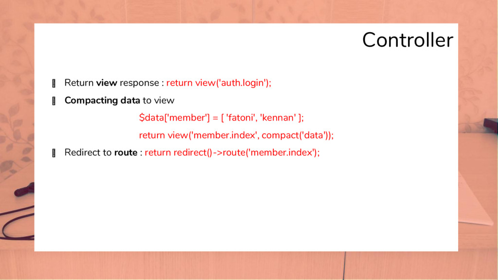 view $data['member'] = [ 'fatoni', 'kennan' ]; return view('member.index', compact('data')); Redirect to route : return redirect()->route('member.index');