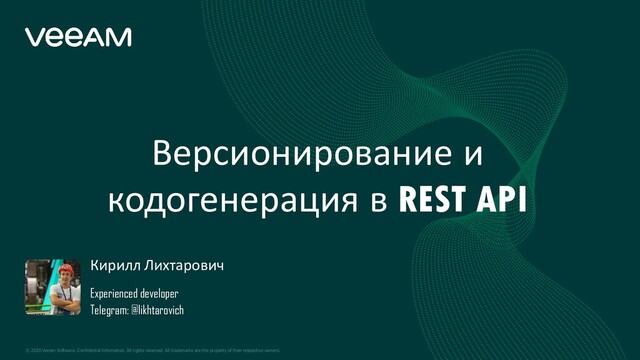 Кирилл расскажет о проблемах версионирования REST API на примерах, покажет какие способы версионирования он применяет и в чём их отличие друг от друга. Познакомимся с разницей между code first и contract first подходов и о том, почему он выбрал contract first как основной для проектирования новых API. Расскажет о кодогенерации и сделает акцент на связке кодогенерации с версионированием. Покажет приниципиальную схему кодогенератора, позволяющего прозрачно и понятно поддерживать разные версии вашего API.
