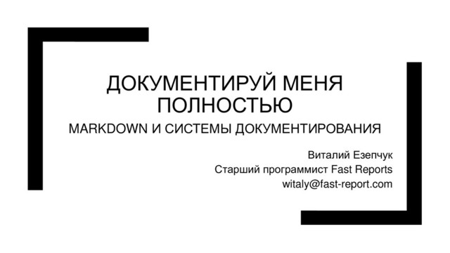 Каждый разработчик сталкивается с проблемами документирования приложений для конечных пользователей или других программистов: выбор среды для документирования, выбор формата хранения документации, быстрое получение нужных выходных форматов, поддержка контроля версий для командной разработки, возможность перевода на другие языки. В докладе будет рассказано про существующие системы документирования, рассмотрены их плюсы и минусы, сделан обзор форматов хранения документации, предложен формат Markdown, как наиболее удобный для написания и хранения документации. Доклад будет интересен программистам, которые хотят писать ХОРОШУЮ документацию, полезную как для конечных пользователей так и для других программистов и техническим писателям.