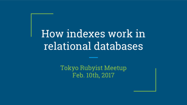 : Oracle, MySQL, PostgreSQL, etc. ◦ Multiple languages : PHP, Java, etc. • Written by Markus Winand • Available in EN, JP, GE, FR, SP ◦ Japanese ver. translator = me • Buy at http://sql-performance-explained.com/ ◦ JP : http://sql-performance-explained.jp/ • Free Web Edition: http://use-the-index-luke.com/