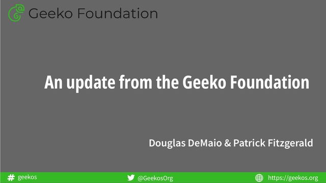 This talk will provide attendees with a comprehensive update on the Geeko Foundation, detailing the funding it has received, how these funds have been utilized, and the progress being made on behalf of its members. Attendees will gain insights into various aspects of the foundation’s financial management, from travel support and sponsorships to fundraising efforts and the overall sponsorship of the project. The presentation will highlight the strategic initiatives undertaken by the foundation's trustees, demonstrating their commitment to advancing the project. By offering a clear picture of the foundation's operations and achievements, this talk aims to inform and engage community members, encouraging greater participation and support for the Geeko Foundation's mission. Members of the Geeko Foundation include Douglas DeMaio, Svebor Prstačić and Patrick Fitzgerald. The foundation is advancing and is looking for help from participants.