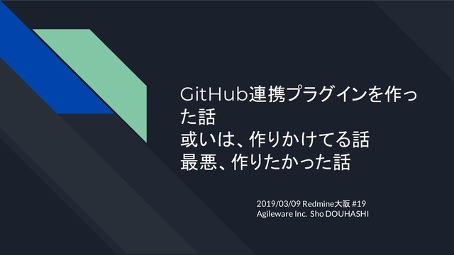 GitHub連携プラグインを作っ た話 或いは、作りかけてる話 最悪、作りたかった話 2019/03/09 Redmine大阪 #19 Agileware Inc. Sho
