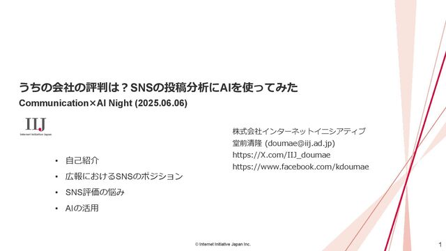 1 © Internet Initiative Japan Inc. うちの会社の評判は?SNSの投稿分析にAIを使ってみた Communication×AI Night (2025.06.06)