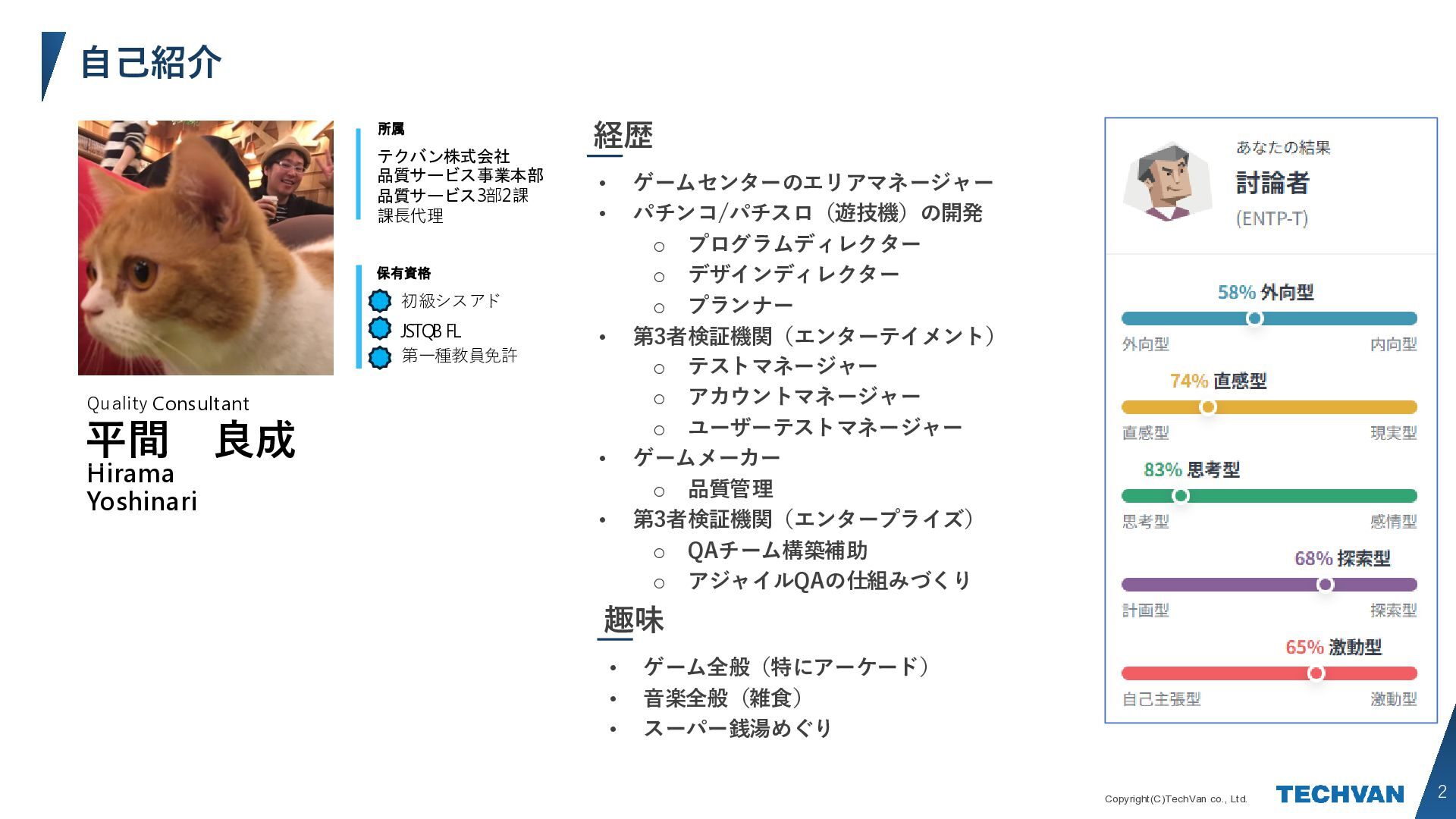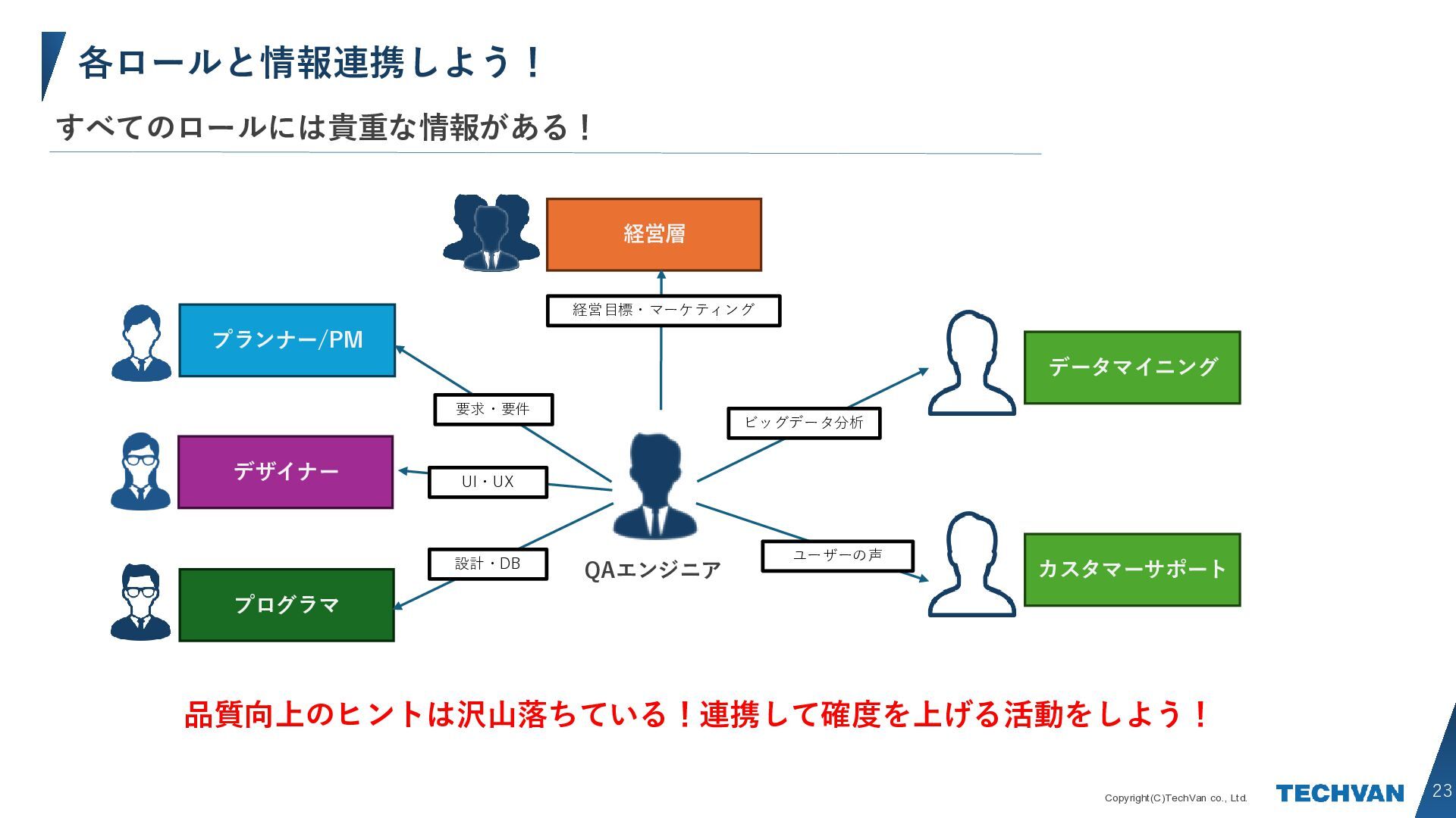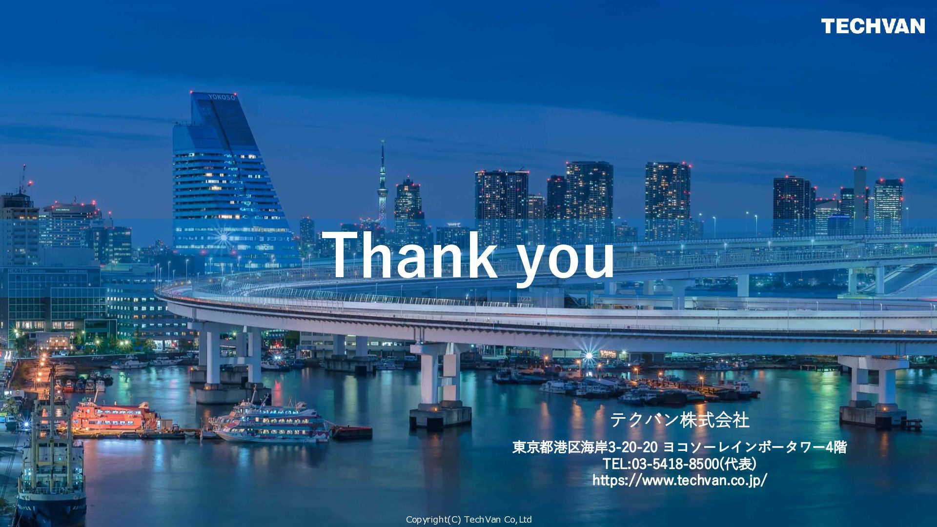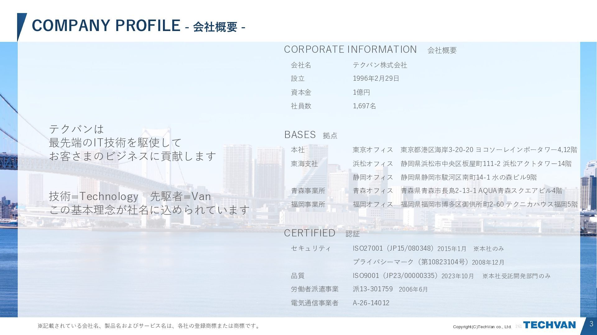 CORPORATE INFORMATION 会社概要 会社名 テクバン株式会社 設立 1996年2月29日 資本金 1億円 社員数 1,697名 BASES 拠点 本社 東京オフィス 東京都港区海岸3-20-20 ヨコソーレインボータワー4,12階 東海支社 浜松オフィス 静岡県浜松市中央区板屋町111-2 浜松アクトタワー14階 静岡オフィス 静岡県静岡市駿河区南町14-1 水の森ビル9階 青森事業所 青森オフィス 青森県青森市長島2-13-1 AQUA青森スクエアビル4階 福岡事業所 福岡オフィス 福岡県福岡市博多区御供所町2-60 テクニカハウス福岡5階 CERTIFIED 認証 セキュリティ ISO27001(JP15/080348)2015年1月 ※本社のみ プライバシーマーク(第10823104号)2008年12月 品質 ISO9001(JP23/00000335)2023年10月 ※本社受託開発部門のみ 労働者派遣事業 派13-301759 2006年6月 電気通信事業者 A-26-14012 261 テクバンは 最先端のIT技術を駆使して お客さまのビジネスに貢献します 技術=Technology 先駆者=Van この基本理念が社名に込められています