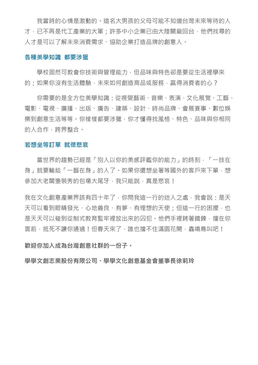 [文創]徐莉玲:學校固然可教會你技術與管理能力,但品味與特色卻是要從生活裡學來的。