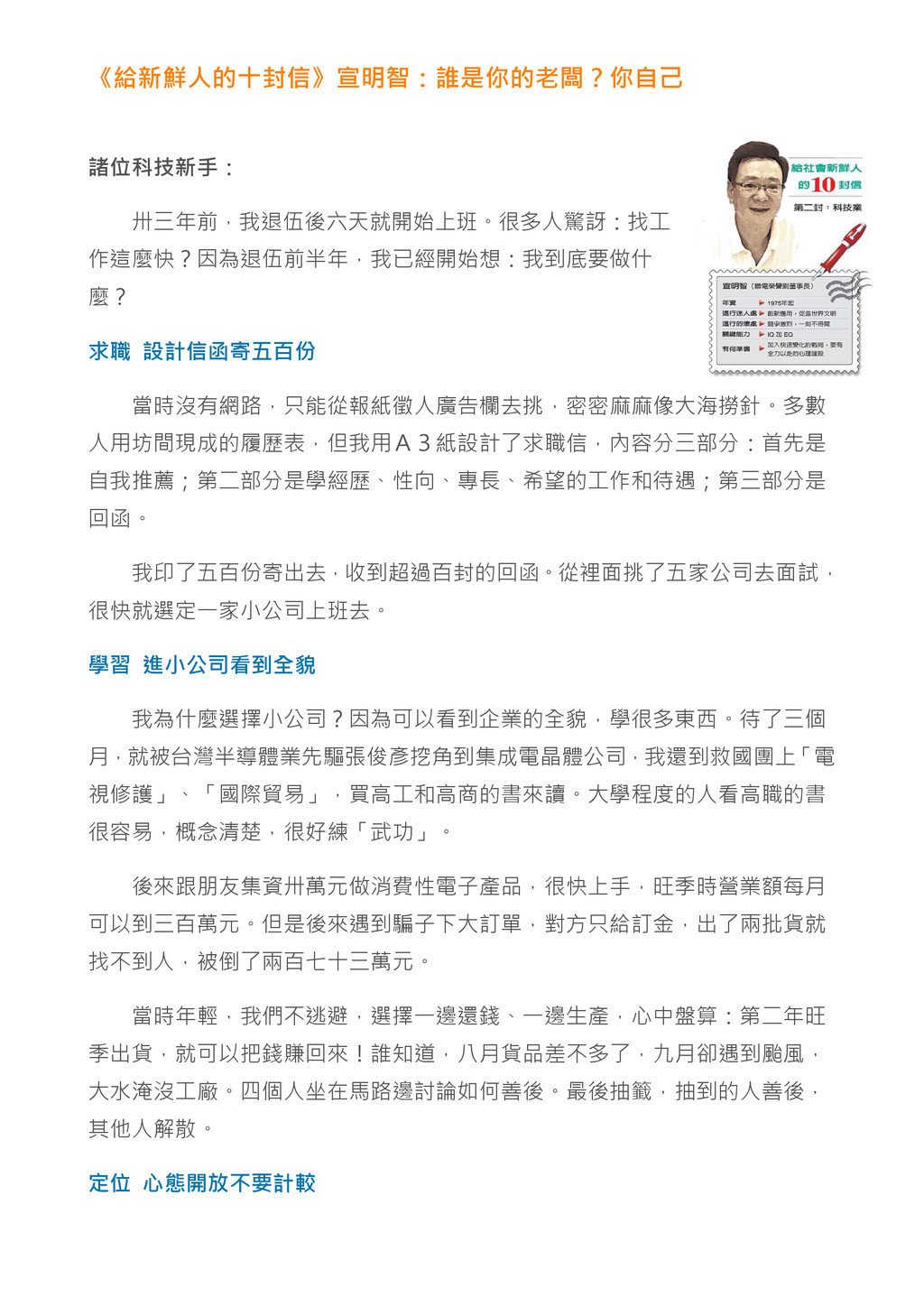[電子]宣明智:新人在職場上,要學習如何在組織中定位自己,而且要快速學習。