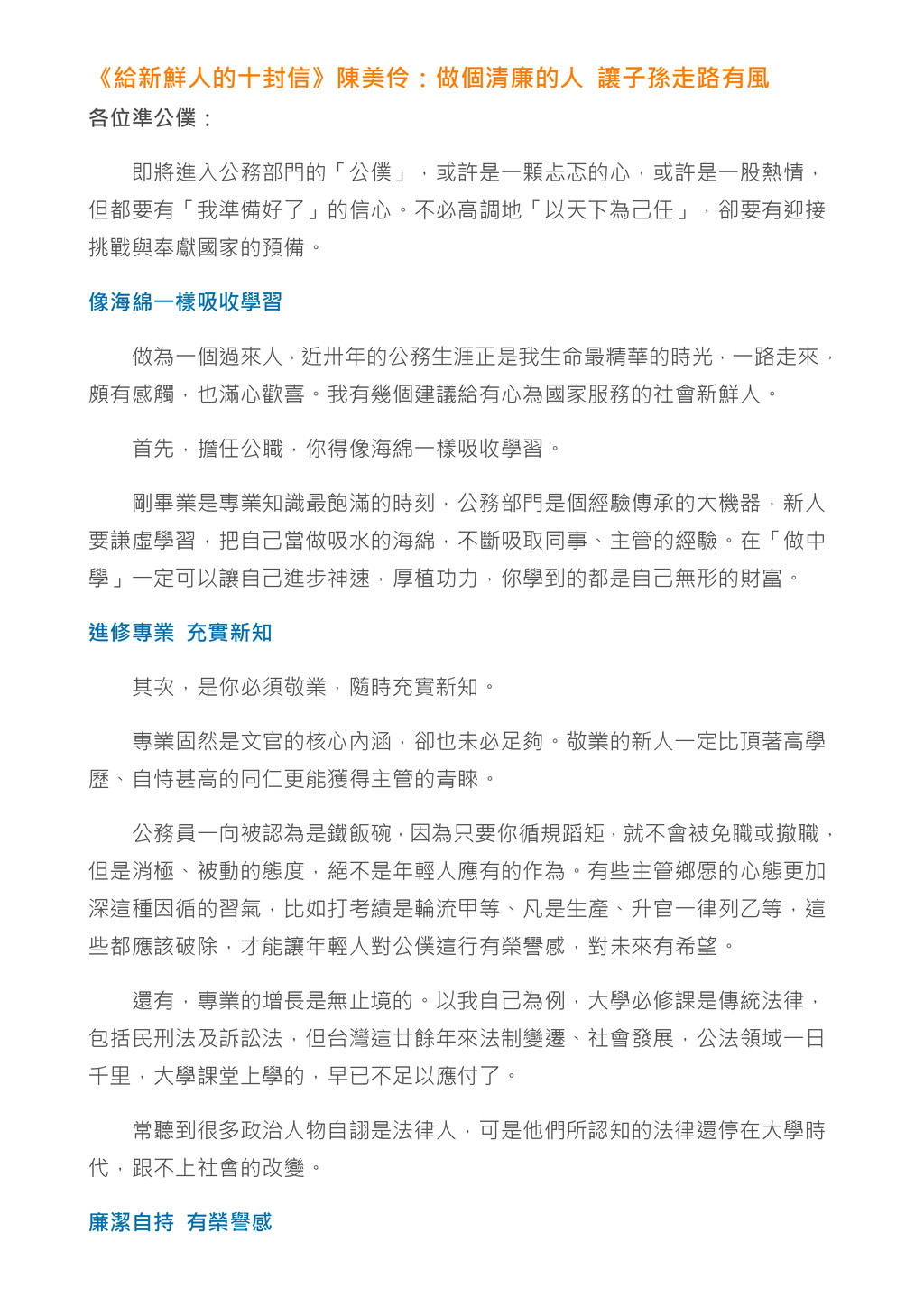 [公職]陳美伶:新人要謙虛學習,把自己當做吸水的海綿,不斷吸取同事、主管的經驗。