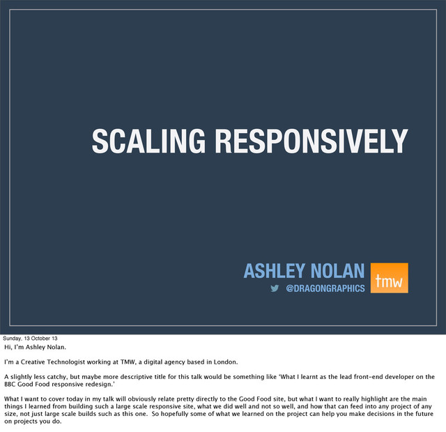 as the lead front-end developer on the BBC Good Food responsive redesign) Sunday, 13 October 13 Hi, I’m Ashley Nolan. I’m a Creative Technologist working at TMW, a digital agency based in London. A slightly less catchy, but maybe more descriptive title for this talk would be something like ‘What I learnt as the lead front-end developer on the BBC Good Food responsive redesign.’ What I want to cover today in my talk will obviously relate pretty directly to the Good Food site, but what I want to really highlight are the main things I learned from building such a large scale responsive site, what we did well and not so well, and how that can feed into any project of any size, not just large scale builds such as this one. So hopefully some of what we learned on the project can help you make decisions in the future on projects you do.
