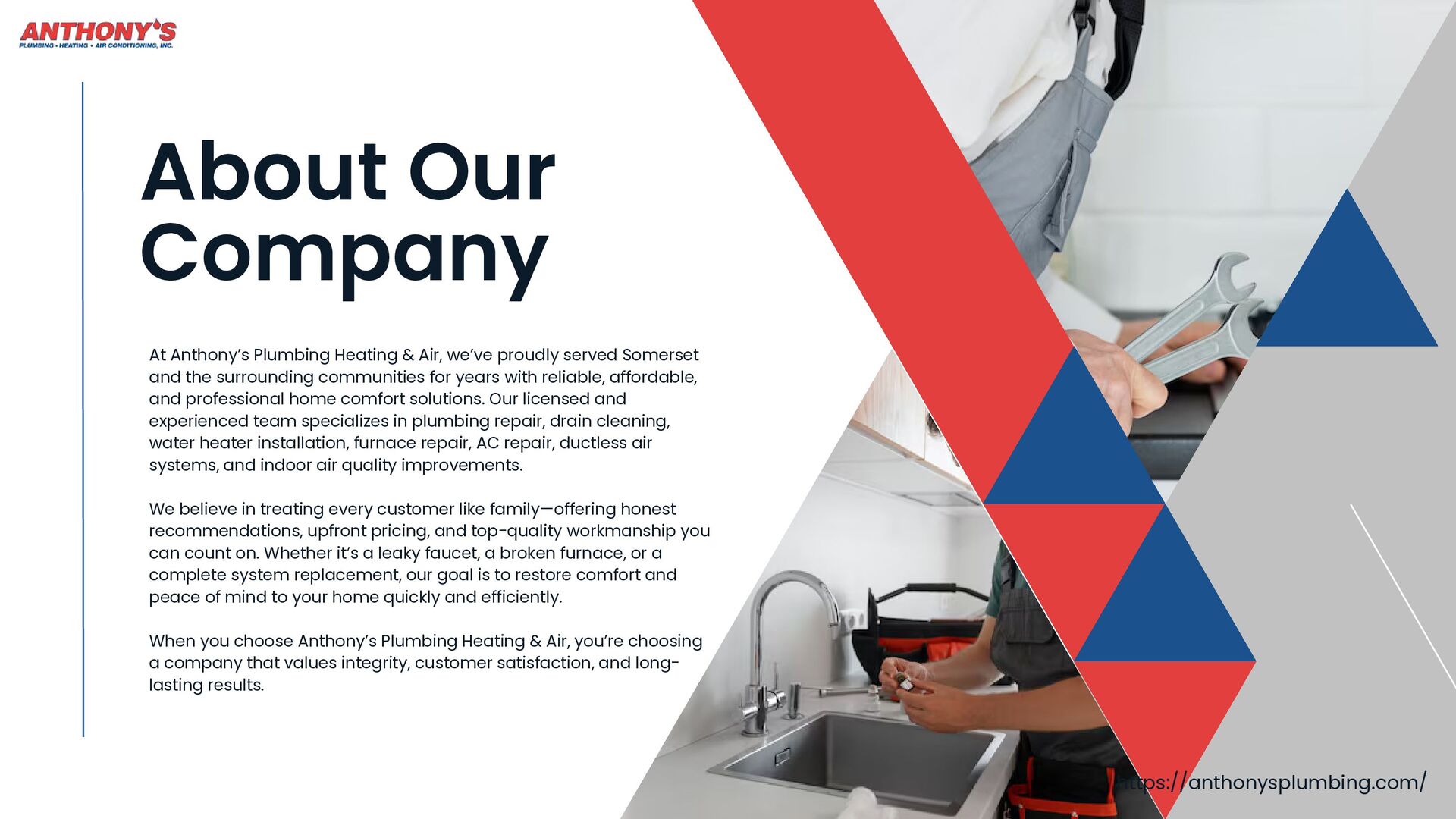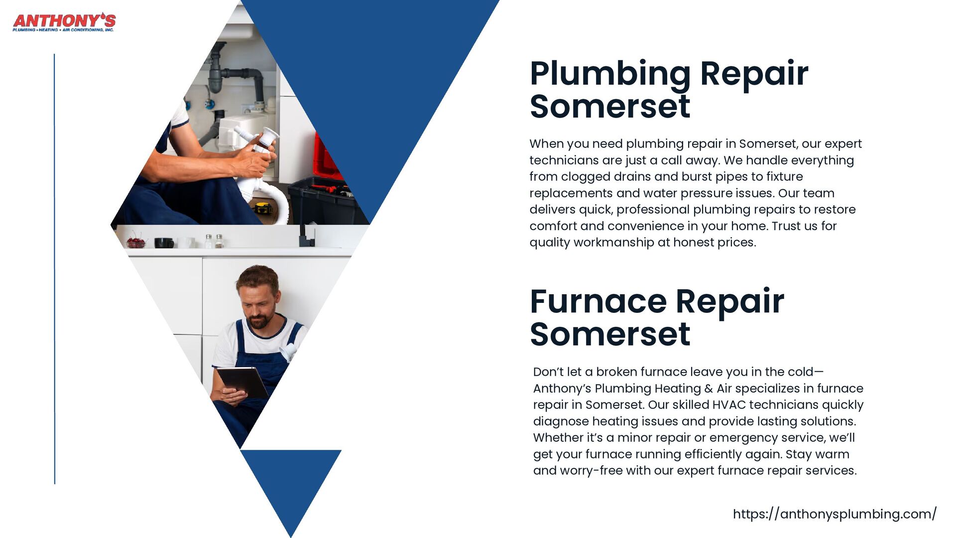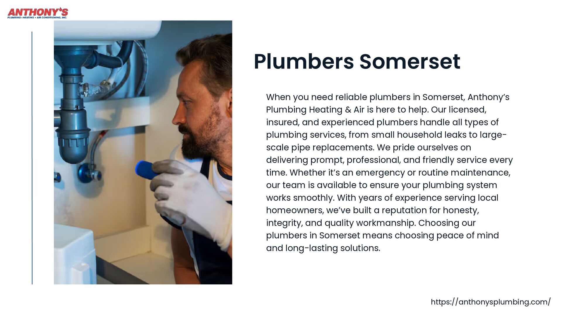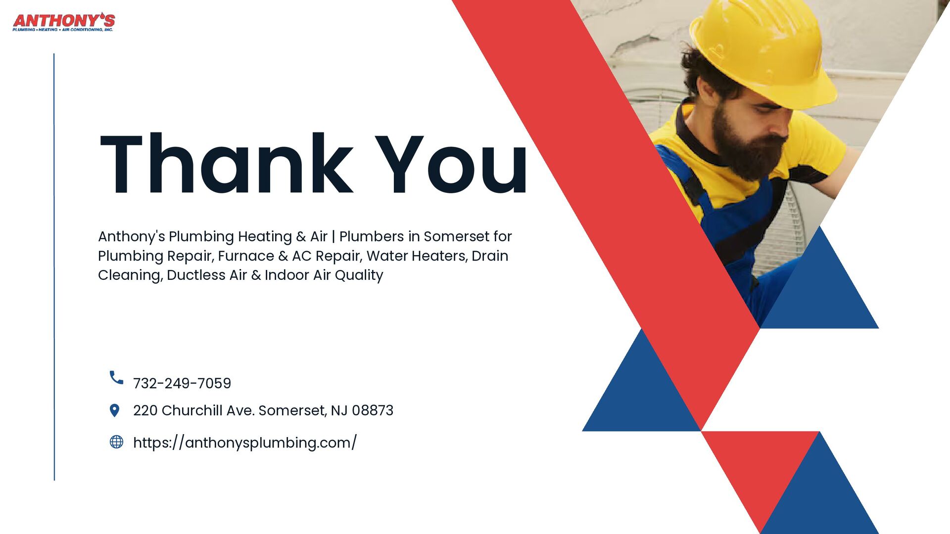 Anthony's Plumbing Heating & Air is your one-stop shop for reliable home comfort solutions in Somerset, New Jersey. From expert Plumbers Somerset residents trust for Plumbing Repair Somerset to certified technicians for Furnace Repair Somerset and AC Repair Somerset, we handle it all.