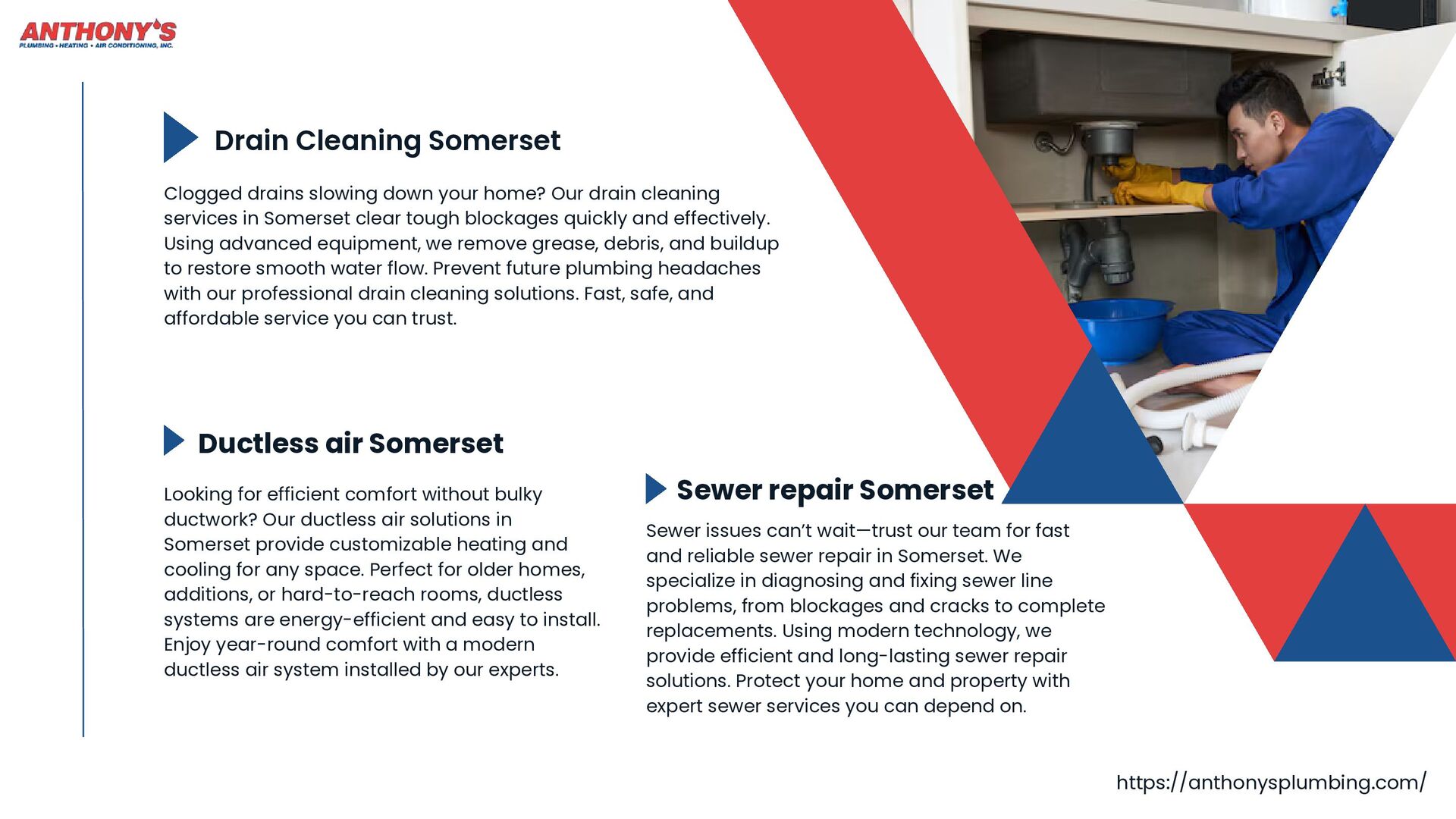 Our services include everything from Drain Cleaning Somerset and Sewer repair Somerset to installing Ductless air Somerset systems and helping you Improve Indoor Air Quality Somerset. We even provide fast Water Heater Somerset service.