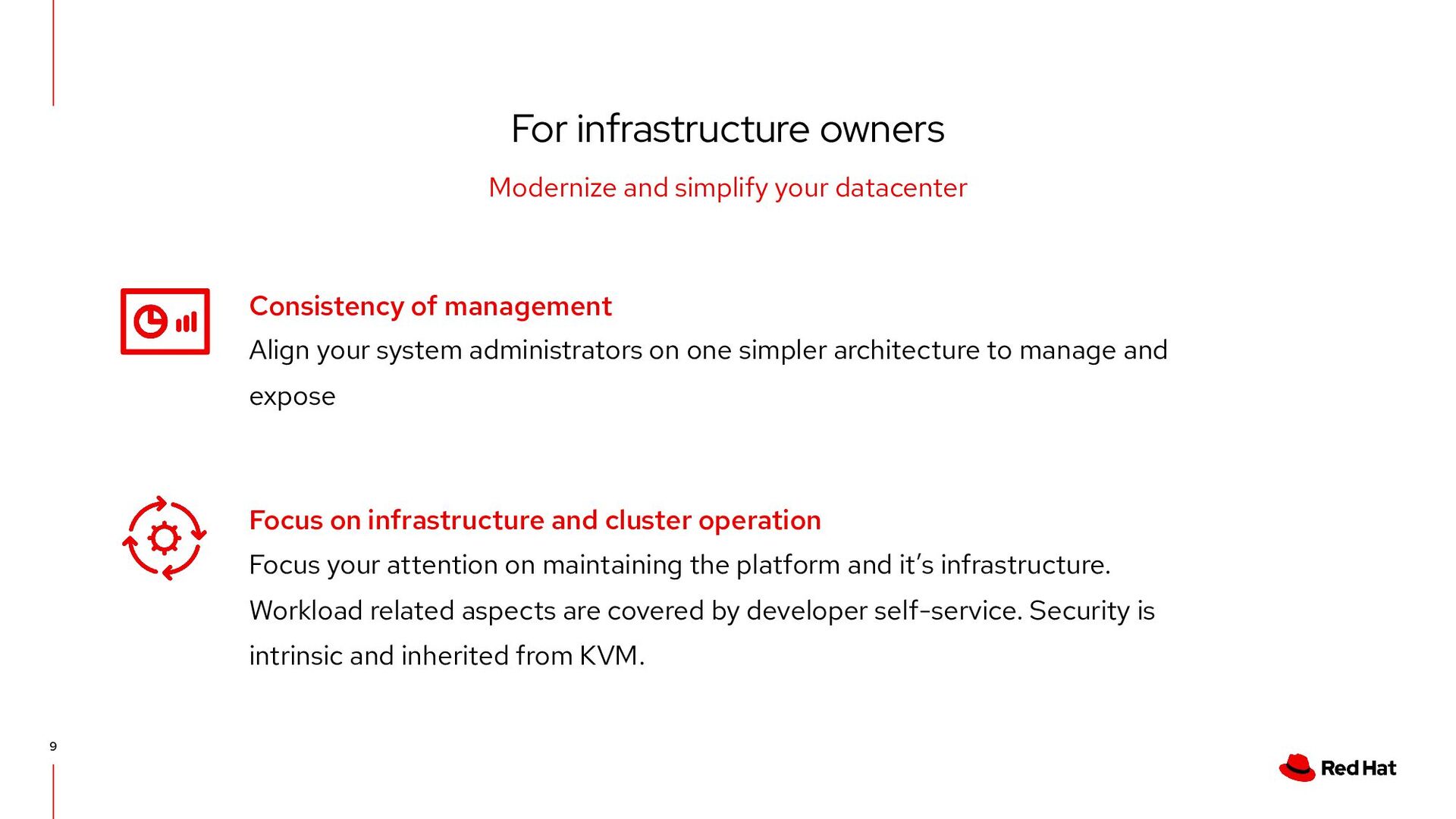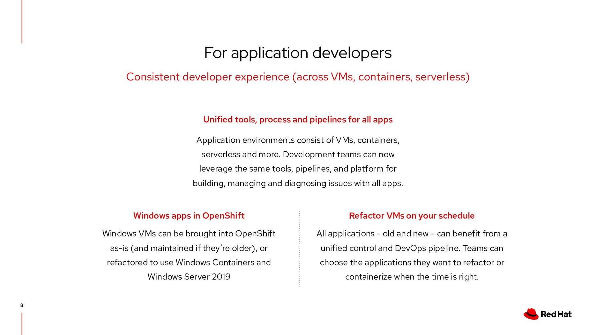 OpenShift as-is (and maintained if they’re older), or refactored to use Windows Containers and Windows Server 2019 All applications - old and new - can benefit from a unified control and DevOps pipeline. Teams can choose the applications they want to refactor or containerize when the time is right. For application developers 8 Consistent developer experience (across VMs, containers, serverless) Refactor VMs on your schedule Unified tools, process and pipelines for all apps Application environments consist of VMs, containers, serverless and more. Development teams can now leverage the same tools, pipelines, and platform for building, managing and diagnosing issues with all apps.
