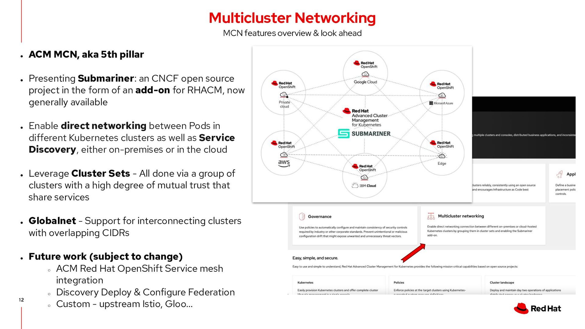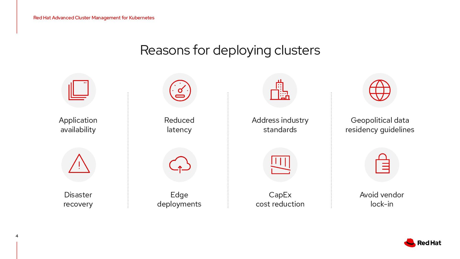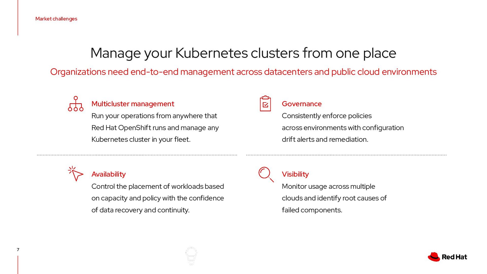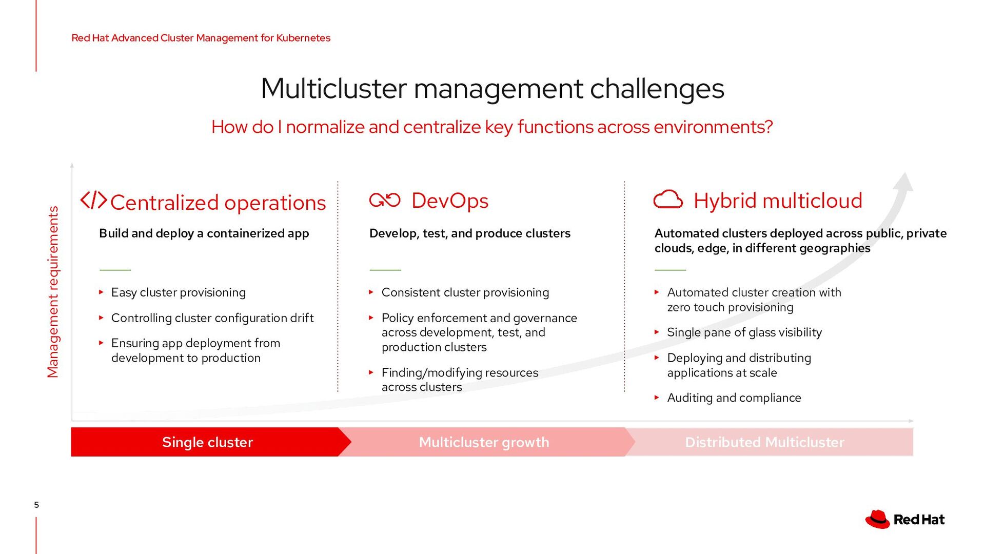 # G00465217, by Tony Iams “As Kubernetes gains adoption across the industry, scenarios are arising in which I&O teams are finding they must deploy and manage multiple clusters, either in a single region on-premises or in the cloud, or across multiple regions….for a number of reasons, including multi-tenancy, disaster recovery, and with hybrid, multicloud, or edge deployments.” Kubernetes adoption leads to multicluster Red Hat Advanced Cluster Management for Kubernetes
