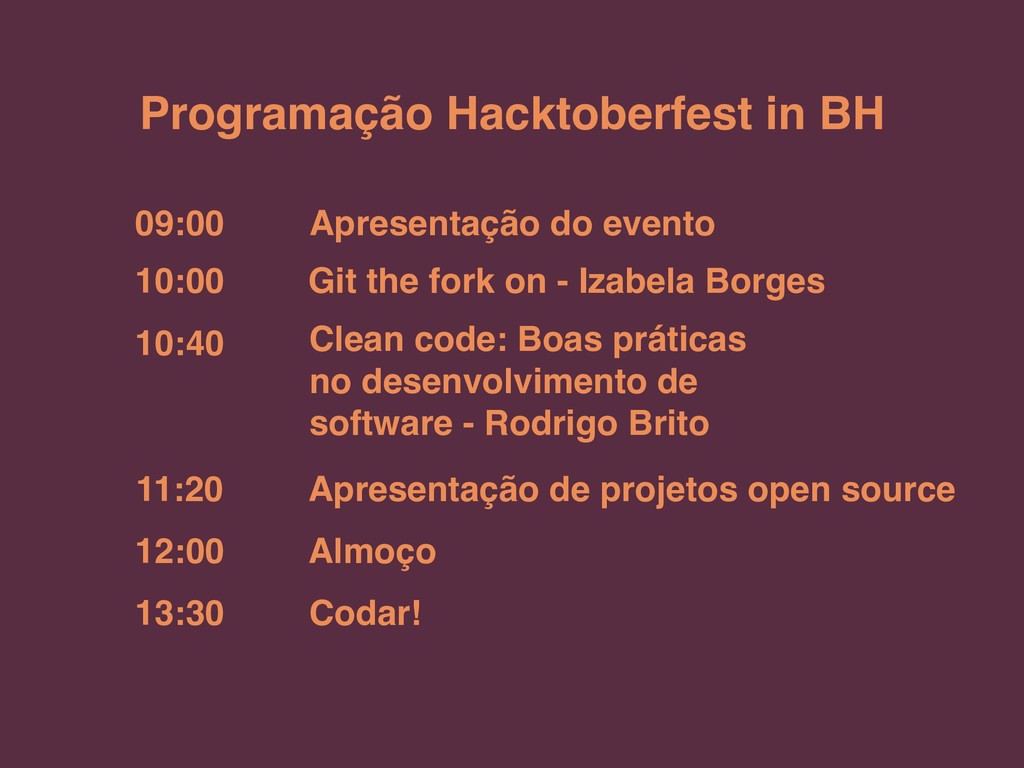 Programação Hacktoberfest in BH 09:00 10:00 10:40 11:20 12:00 13:30
