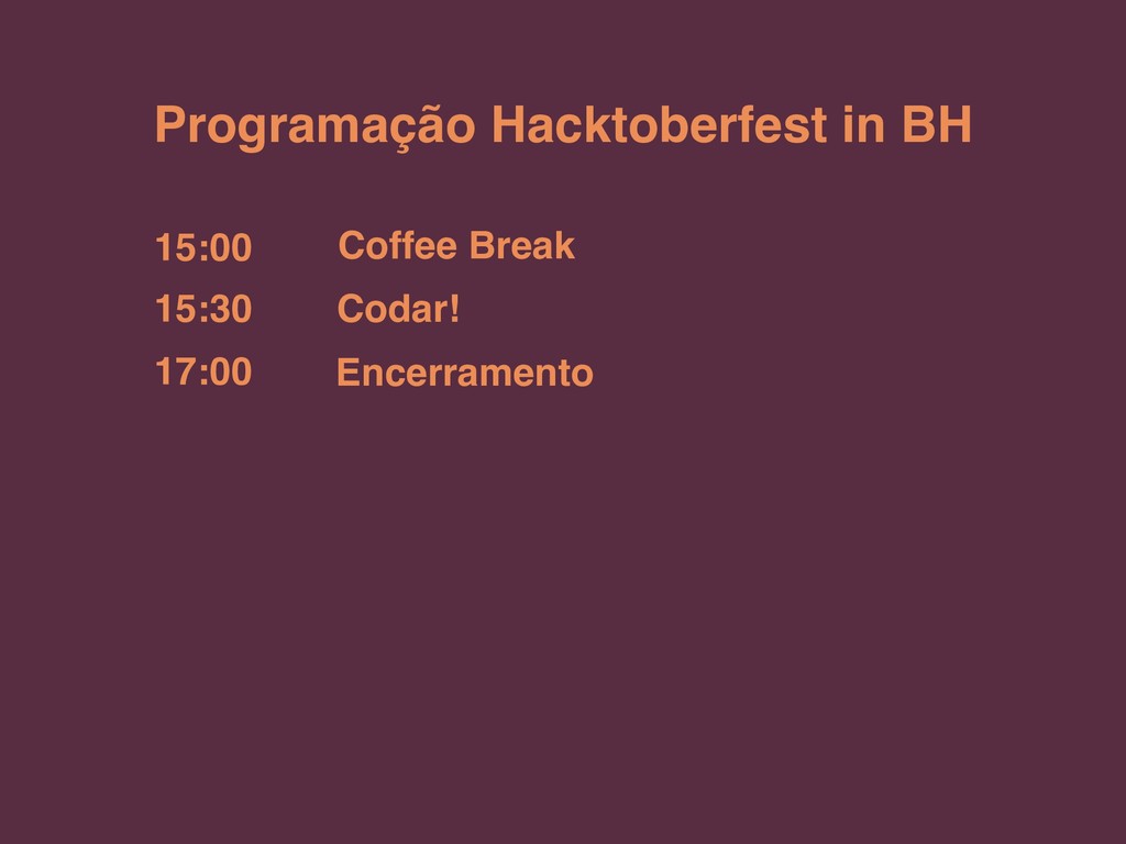 Programação Hacktoberfest in BH 15:00 15:30 17:00 Coffee Break Codar!
