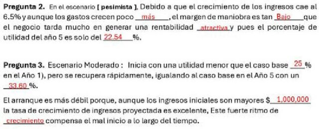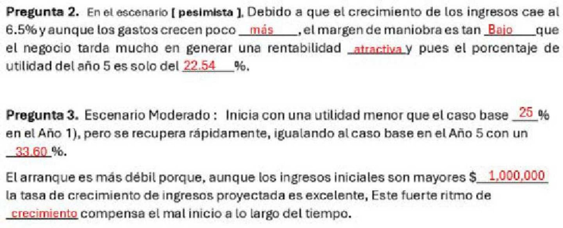 el crecimiento de los ingresos cae al 6.5%y aunque los gastos crecen poco más_ _,el margen de maniobra es tan Bajo _que el negocio tarda mucho en generar una rentabilidad atractiva.y pues el porcentaje de utilidad del año 5 es solo del 22.54 %. Pregunta 3. Escenario Moderado : Inicia con una utilidad menor que el caso base 25 % en el Año 1), pero se recupera rápidamente, igualando al caso base en el Año 5 con un El arranque es más débil porque, aunque los ingresos iniciales son mayores $ 1.OOO,O0O la tasa de crecimiento de ingresos proyectada es excelente, Este fuerte ritmo de crecimiento compensa el mal inicio a lo largo del tiempo.