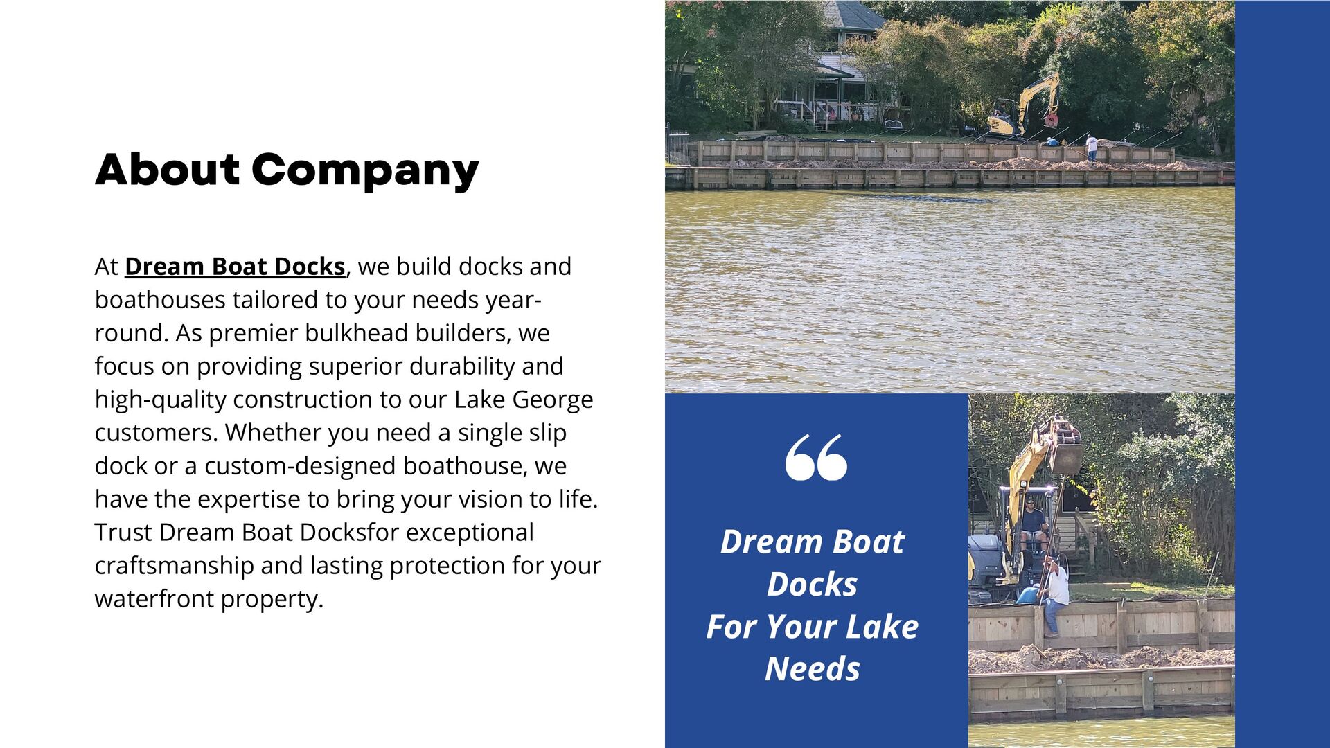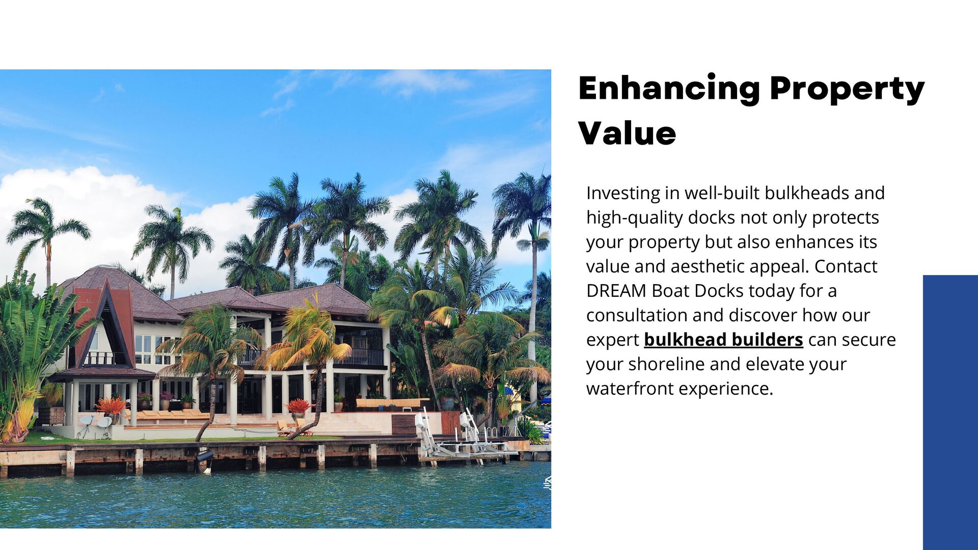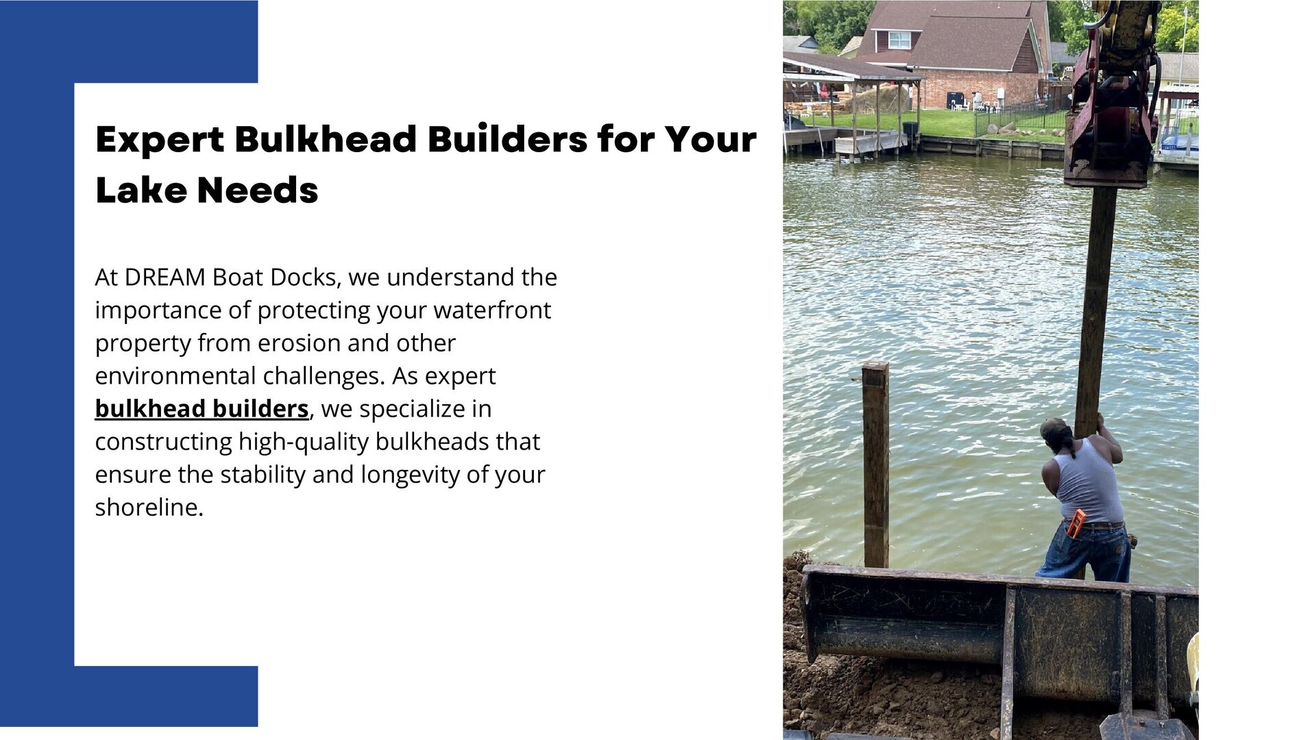 Dream Boat Docks, expert bulkhead builders, protect your property from erosion and marine borers with high-quality bulkheads. We offer customized solutions, from single slip docks to custom boathouses, ensuring durability and enhancing property value. Contact us today for exceptional craftsmanship and personalized service.
