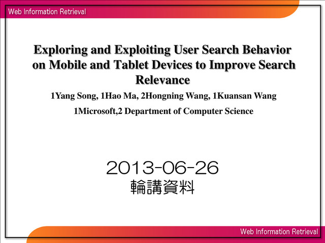 Features ・KL(カルバック・ライブラー情報量) ※クエリとURLのトピック(class)の近さ(確率分布の差異),classは80カテゴリほど(Query,URLは推定済み) ・click-prob: loc = {city,state} ex) loc = {Washington,U.S.} ⇒ コード上では都市と国名はIDで管理 ・wiki-prob: knowledge base サイトのクリックを考慮。 knowledge base のリストはWikipedia, Freebase, Yahoo! answers, eHow など30。