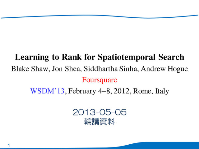 Bruce Croft. Linear feature-based models for information retrieval. Information Retrieval, 10(3):257–274, June 2007. –線形回帰の最適化、ドメイン知識を組み込める •LambdaMART – Q. Wu, C. J. Burges, K. M. Svore, and J. Gao. Adapting boosting for information retrieval measures. Information Retrieval, 13(3):254–270, June 2010. –決定木のアンサンブルによるランキング学習法