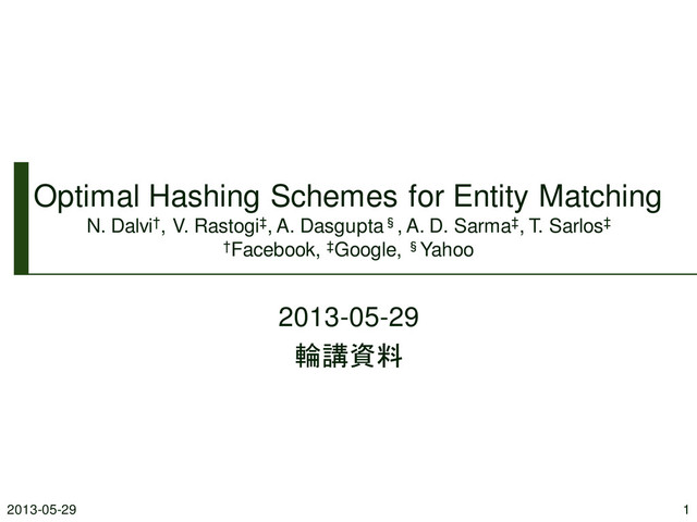 2013-05-29に職場の輪講で発表した資料をアップロード. WWW2013で発表された,Webページなどから抽出した大量の固有表現(人名・組織名などなど)に対して一致判定を行う際に,その一致判定ルールを最適化する方法について理論的にアプローチしている論文です.