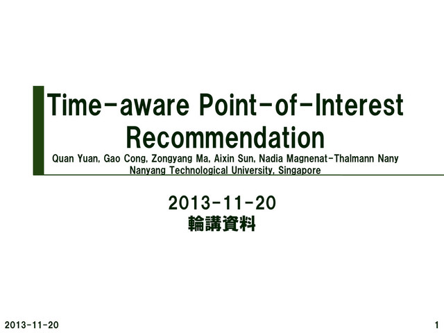 2013-11-20に職場の輪講で発表した資料をアップロード. SIGIR2013で発表された,Point of Interest(POI:店舗,ランドマーク,観光地など)の推薦手法の論文.時間帯ごとのチェックイン特徴の類似性を利用して,各時間帯にあわせたPOIを推薦するのが特徴です.