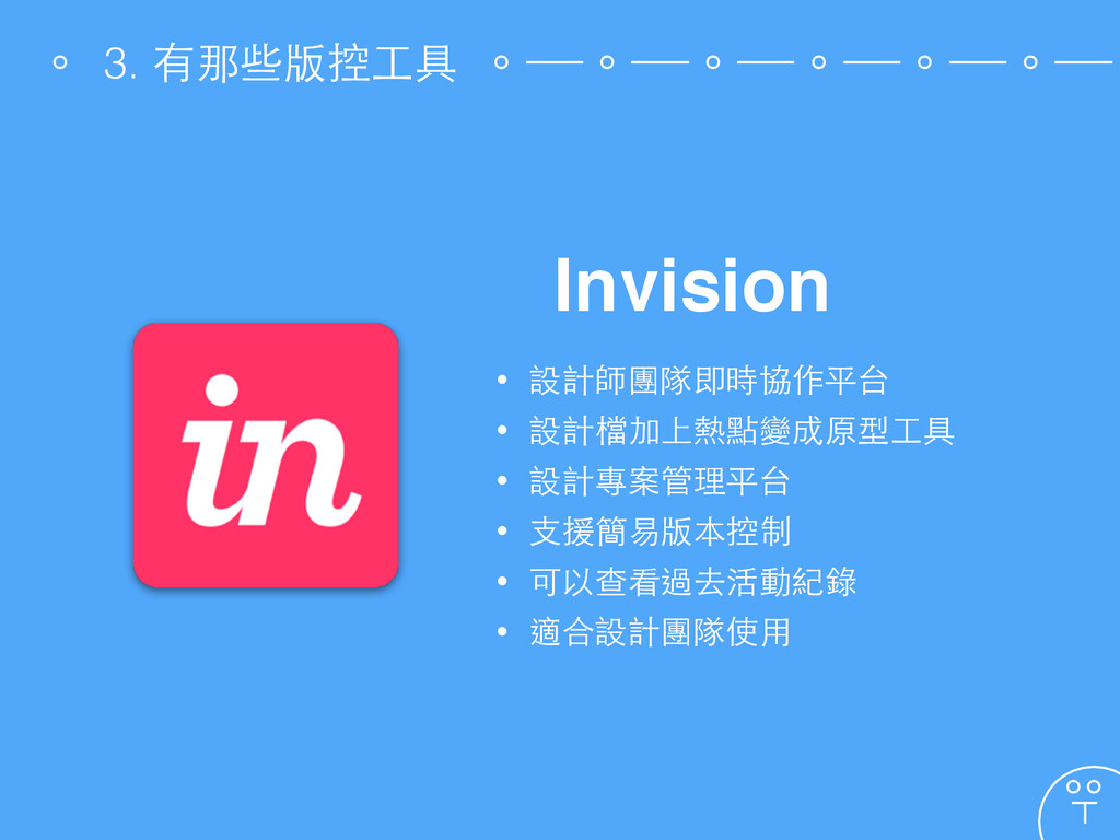 Invision • 設計師團隊即時協作平台 • 設計檔加上熱點變成原型⼯工具 • 設計專案管理平台 • ⽀支援簡易版本控制 •